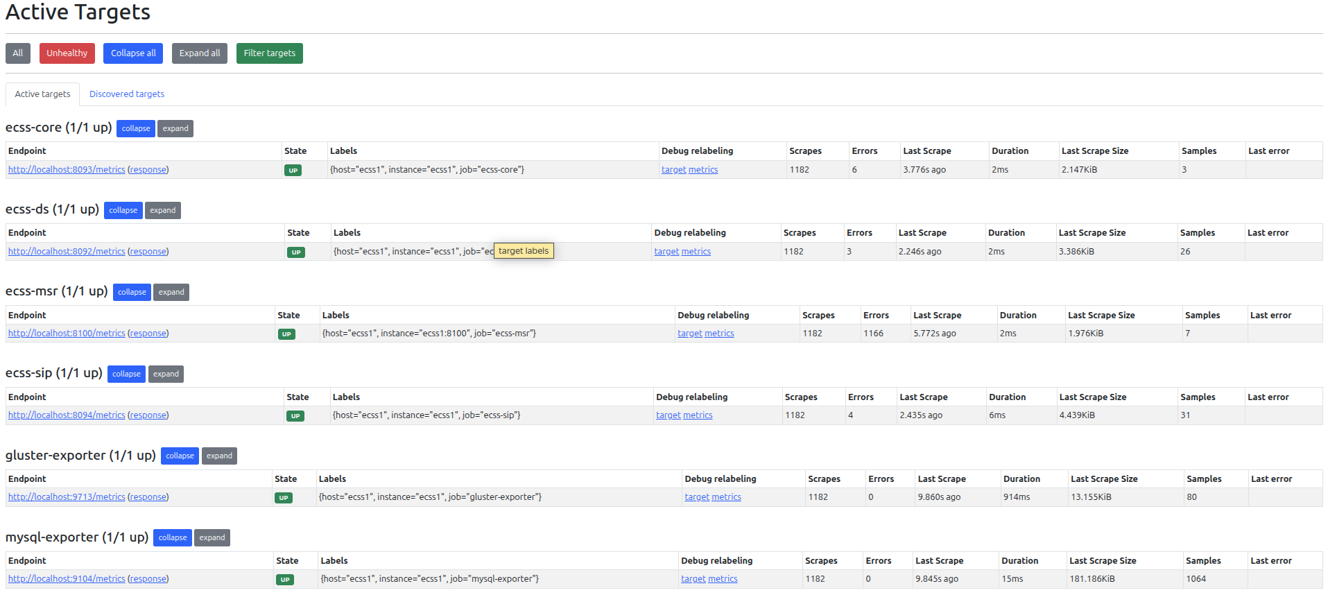 Видно, что статус метрик "ecss-core" / "ecss-ds" / "ecss-sip" / "ecss-msr"/ "gluster-exporter" / "mysql-exporter" = "UP" ("gluster-exporter" и "mysql-exporter" включили при установке ответом на вопрос "Настройте какие экспортеры будут установлены.")
