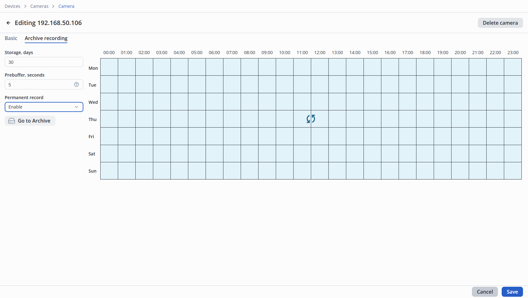 To configure the archive on the camera, switch to the Archive page in the Video surveillance section.