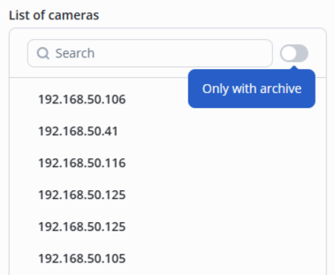 To display only cameras with archives, set the Only with archive switch to the ON position.