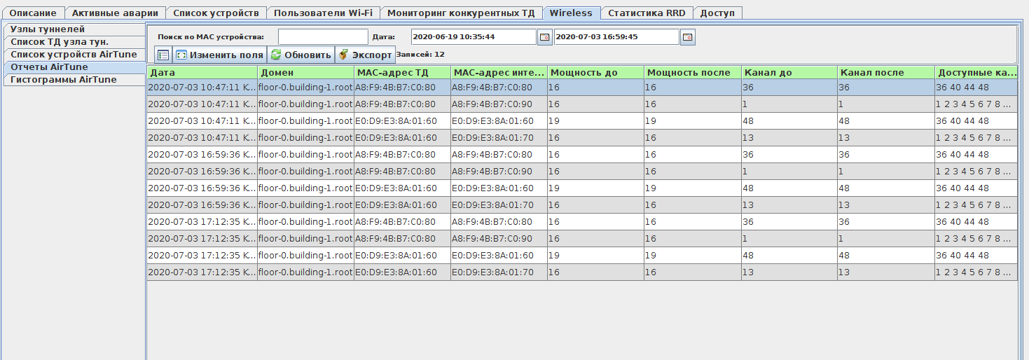 На вкладке "Отчеты AirTune" в табличном виде представлена информация о результатах прошедших оптимизаций TPC/DCA, представленные данные помогают проанализировать в какой момент времени производилась очередная оптимизация, а так же результат ее выполнения.