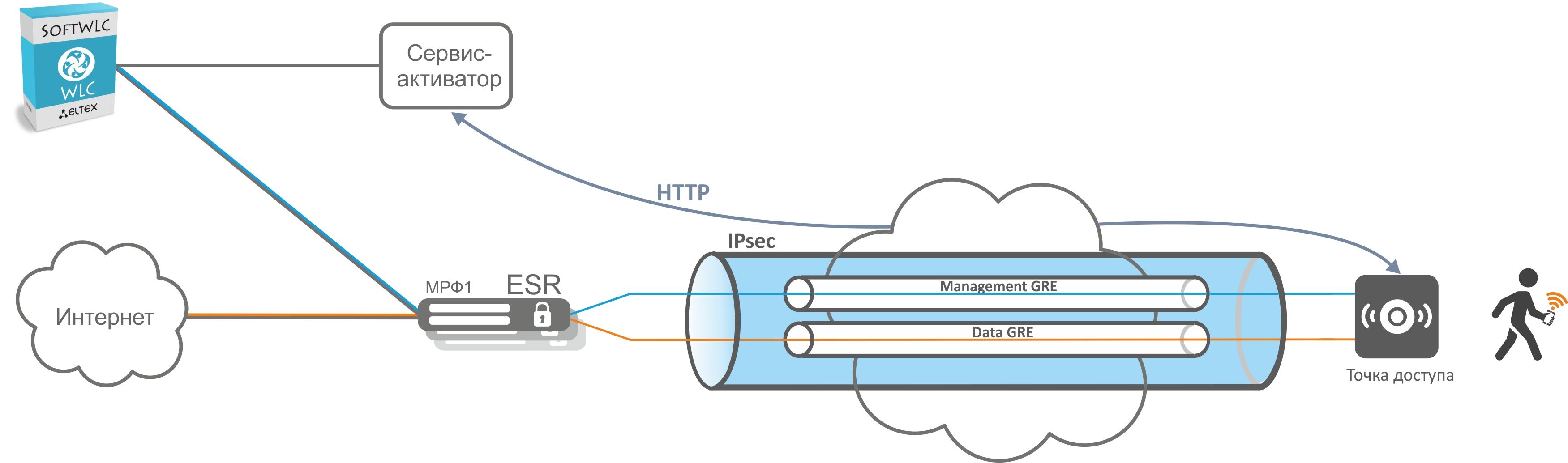 Пример приведен для версии 1.4.0, со статичной маршрутизацией, для моделей ESR, не имеющих аппартной поддержки EoGRE туннелей. В приведенном примере используется следующая адресация: