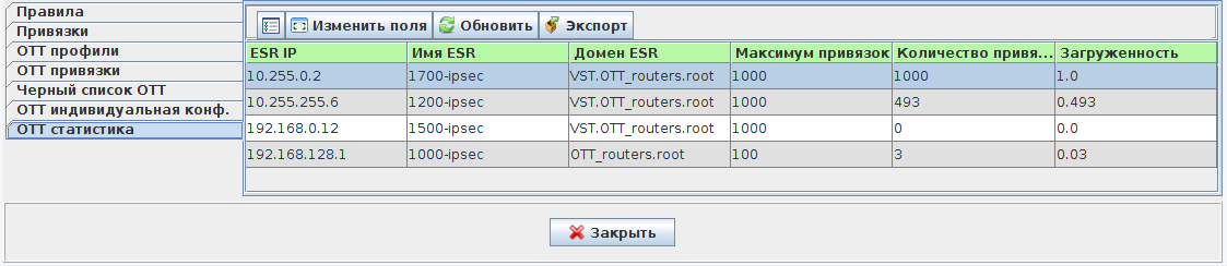 - Загруженность - коэффициент загруженности ESR OTT-привязками. Изменяется от 0 (не загружен) до 1 (полностью загружен, в этом случае новые OTT-привязки на него не создаются, в .т.ч. и в ручном режиме).