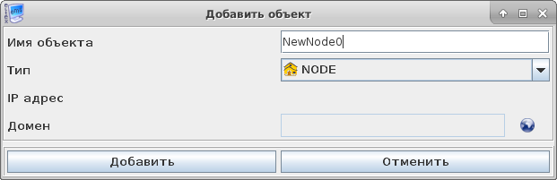 Добавление объекта в дерево производится при помощи кнопки ("Добавить") в области дерева объектов. При добавлении объекта необходимо указать его уникальное имя, тип и IP-адрес. Для узлов (NODE) необходимо указать только имя, домен является необязательным парамемтром.