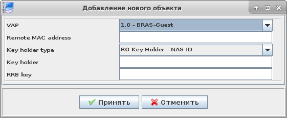 MAC – адрес точки доступа указывается в поле "Ключ". Также требуется указать имя привязываемого правила инициализации (нажмите кнопку в конце строки, чтобы выбрать из существующих правил), домен правила, а также домен узла, в который будет помещена точка доступа. При этом при сложной иерархии домена узла будут созданы все необходимые узлы и подузлы.