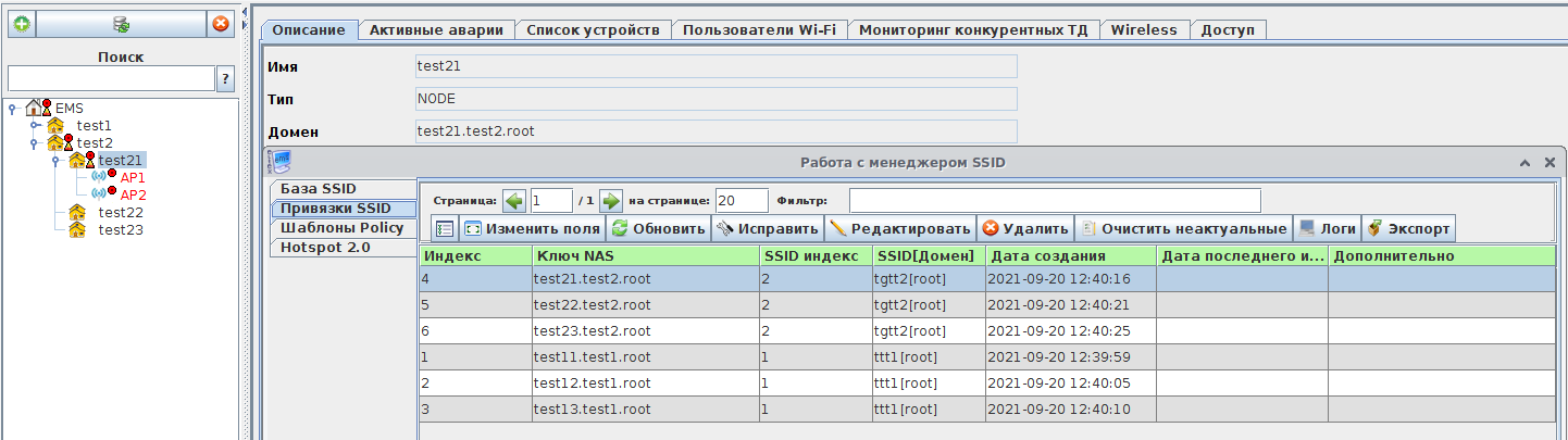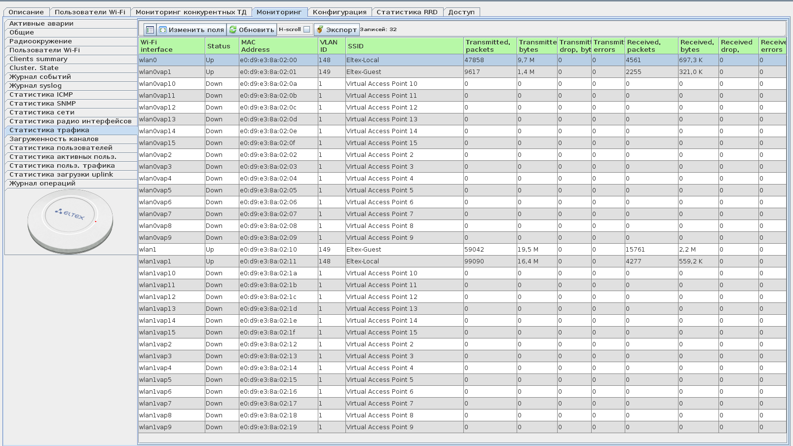 В разделе доступна общая информация обо всех подключенных точках доступа, находящихся в системе, статистические данные подключенных к ним пользователей, а также сводная информация по SSID, отражающая их общее количество, названия, статус, присвоенный домен и количество подключенных точек доступа и пользователей.