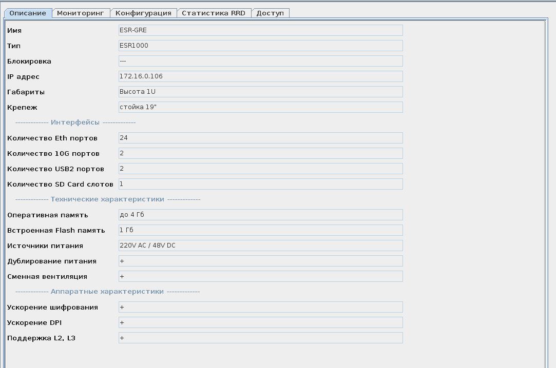 - Поле настроек, которое базируется на выборе объекта в дереве. Предназначено для просмотра и редактирования параметров устройства. Поле настроек содержит закладки, выполняющие функции переключателя групп редактируемых параметров. Часть параметров доступна в режиме "только для чтения", другие предназначены для редактирования. Если у пользователя системы есть права на редактирование текущих параметров, кнопка "Редактировать" становится активной. В противном случае кнопка неактивна и действие недоступно. Такая же система применяется в пунктах меню, панели инструментов и всплывающем меню.