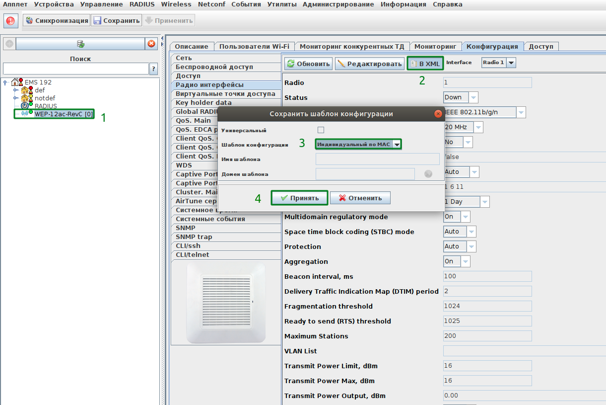 Шаблон конфигурации – имя файла шаблона, конфигурация из которого будет назначена на точку доступа;