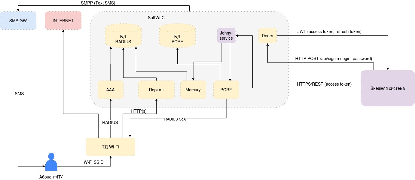 Eltex-johnny - это сервис, реализующий API для управляемого предоставления услуги Wi-Fi. При помощи данного сервиса сторонняя система может создать, редактировать и удалить портального пользователя извне системы SoftWLC. Также при помощи данного сервиса можно регулировать блокировку услуги Wi-Fi для определенного клиента или для всего сервисного домена, используя НЛС прикреплённого к сервисному домену внутри системы SoftWLC.