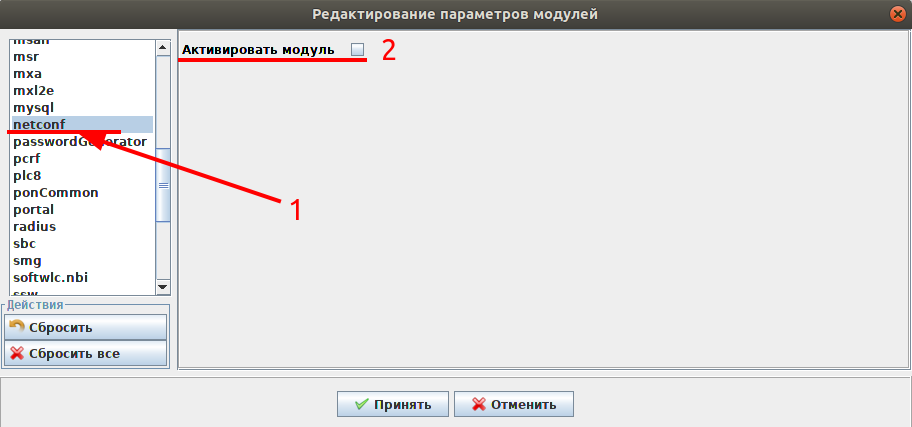 2. В окне "Редактирование параметров модулей" выберите вкладку "netconf". И снимите флаг для параметра "Активировать модуль".