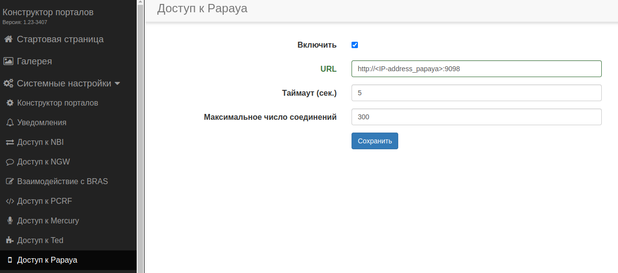 portal: baseUrl: http://<IP-address_portal>:9000/eltex_portal/ # URL сервиса Captive Portal, на котором будет происходить аутентификация пользователей connectionTimeoutMs: 1000 # Время ожидания подключения в милисекундах totalConnections: 1 # Максимальное количество одновременных подключений