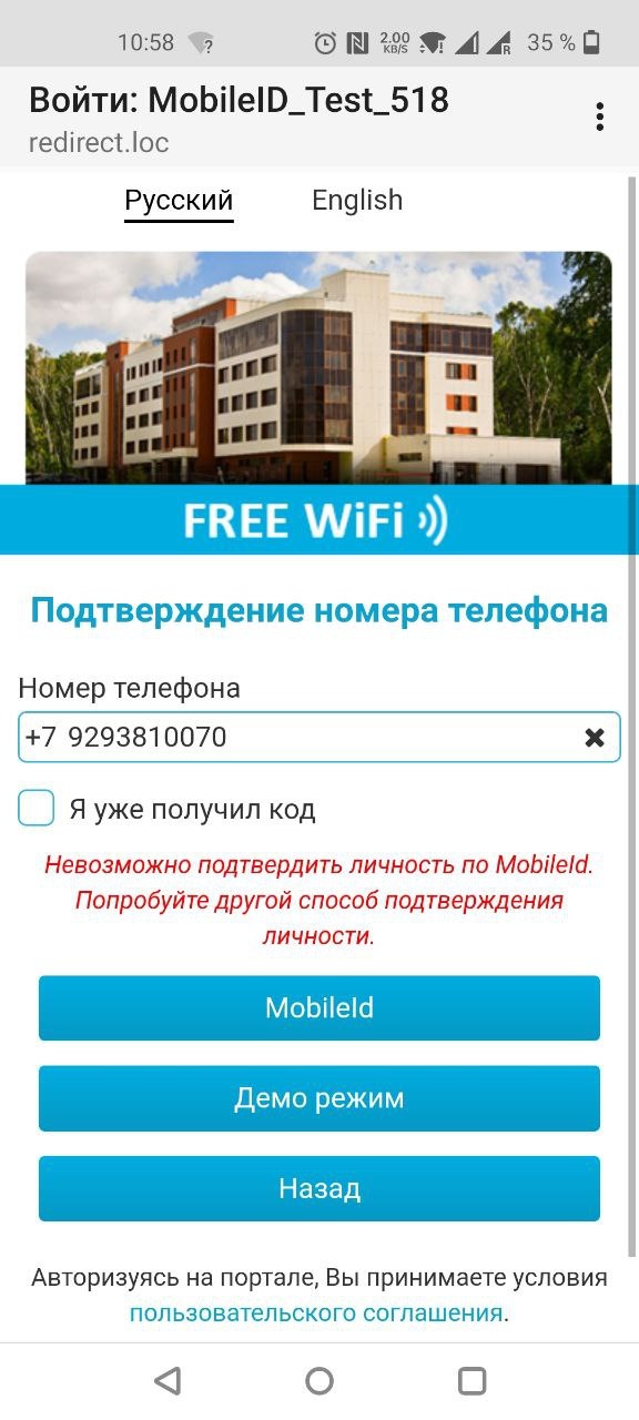 Получили от портала запрос на авторизацию с представленным номером телефона. Замечание: нельзя одновременно авторизоваться с одним номером телефона на двух устройствах. MobileID держит только одну сессию за время, так что на одном из устройств будет неуспех. | OpenIdAuthorizationService.processMobileIdAuth$suspendImpl(line:184). Received auth request for phone 79585150889 |
