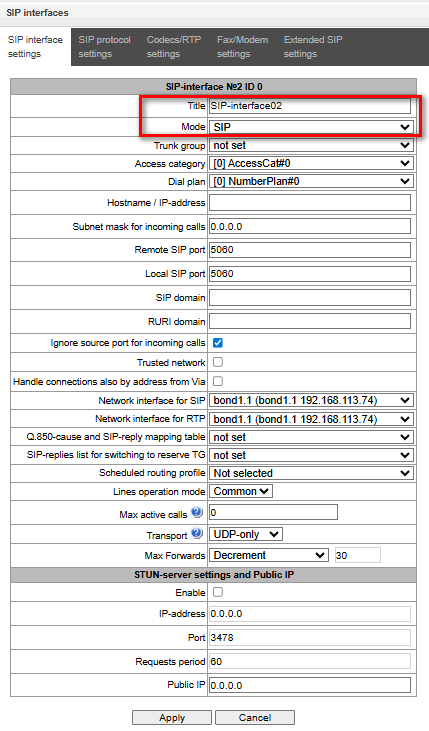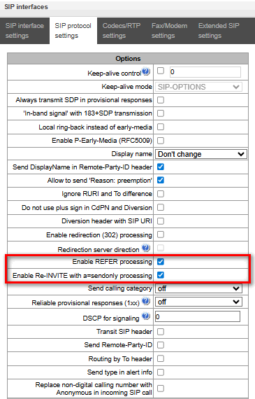 • Move to SIP protocol settings, activate Enable REFER processing and Enable Re-INVITE with a=sendonly» — necessary for the proper functioning of services such as call hold and call transfer.