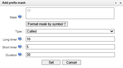 • Enter the mask in the appropriate field (the mask must be enclosed in parentheses), for example, (7x.), so that all outgoing calls to any numbers beginning with 7 will be routed to the current prefix.