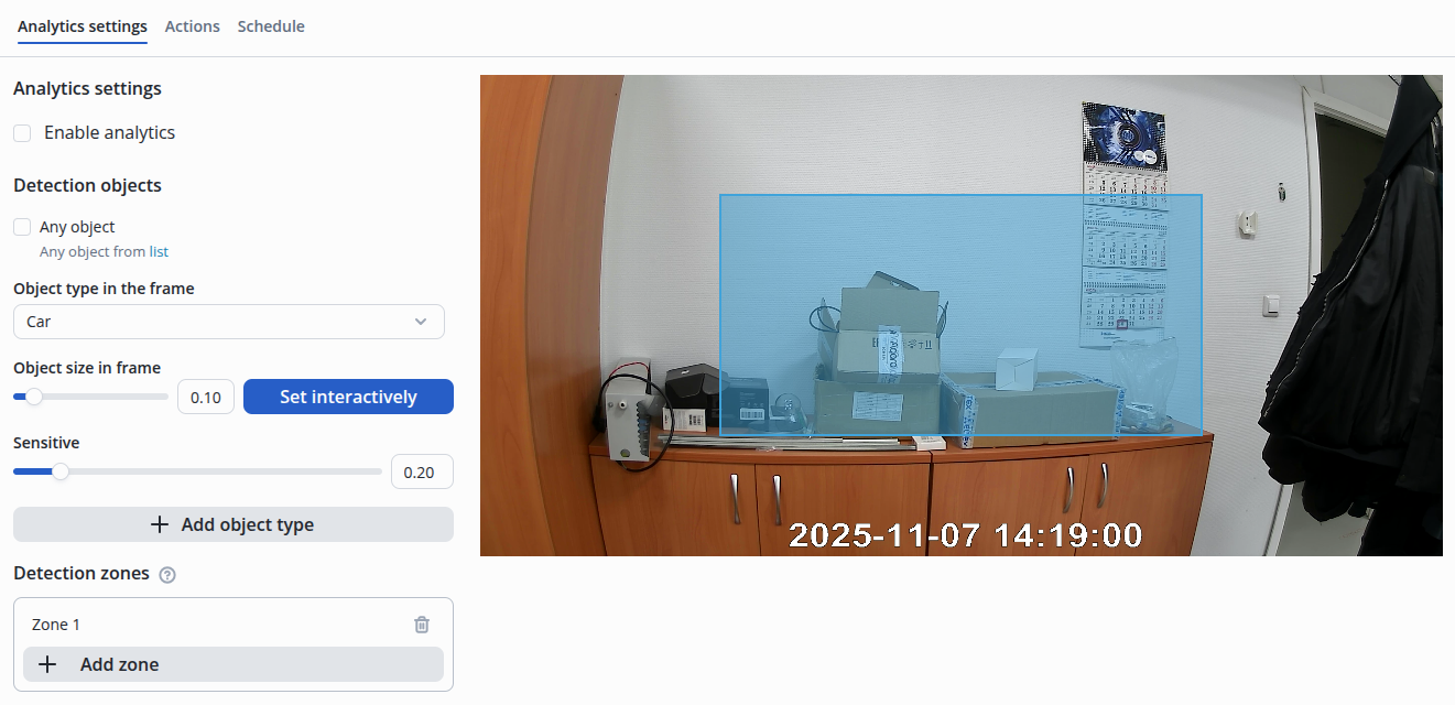 - Object type in the frame — object on which detection will be triggered;