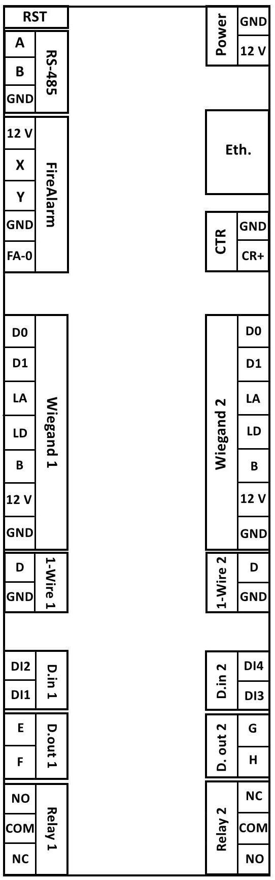 | Wiegand 1, Wiegand 2 — connection contacts of the Wiegand RFID reader: | |
