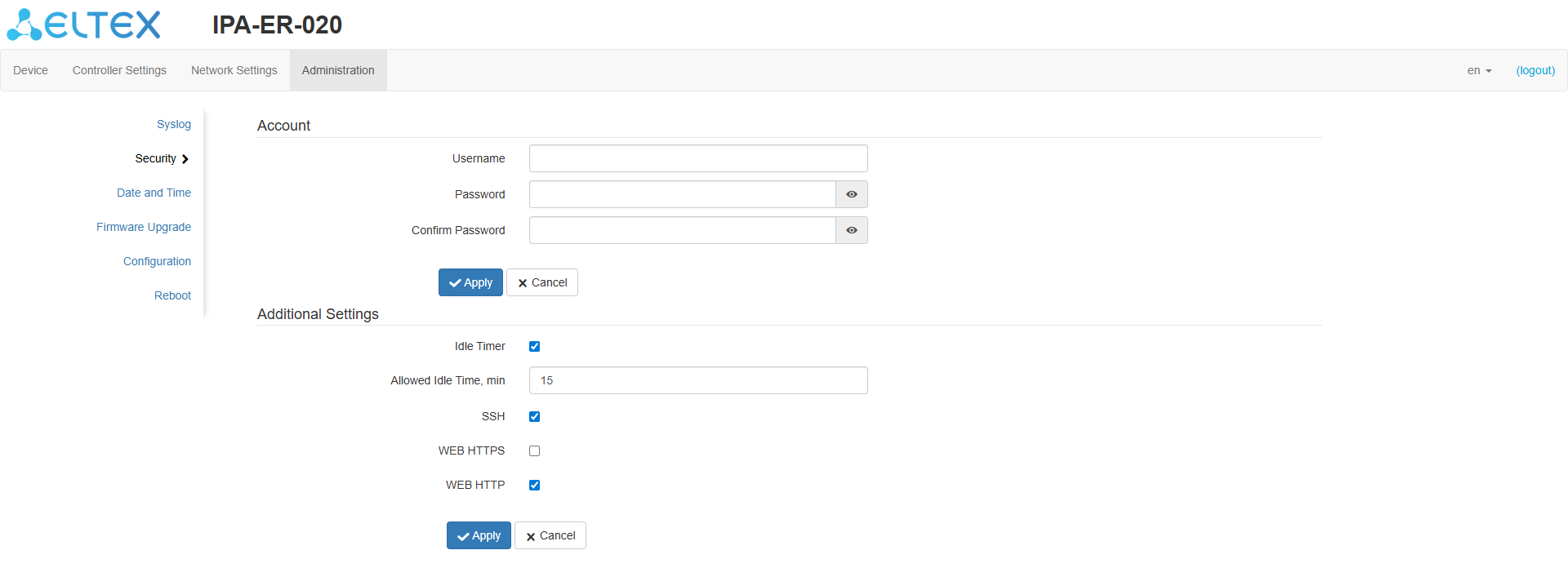 1. Switch to the "Administration" -> "Security" page and, for security purposes, change the password of the admin user to arbitrary. The default value is admin.
