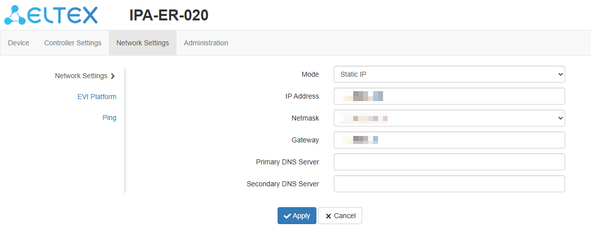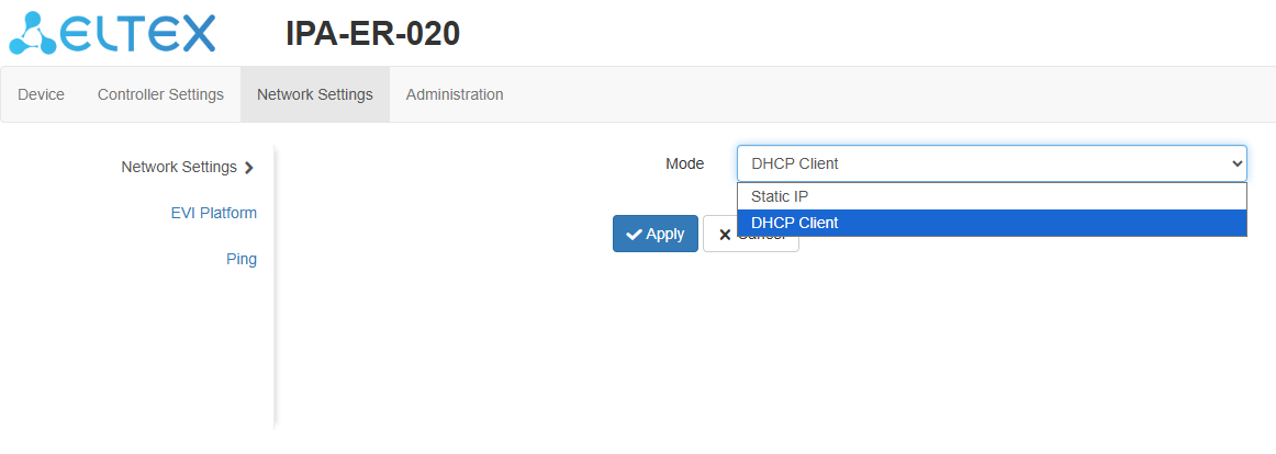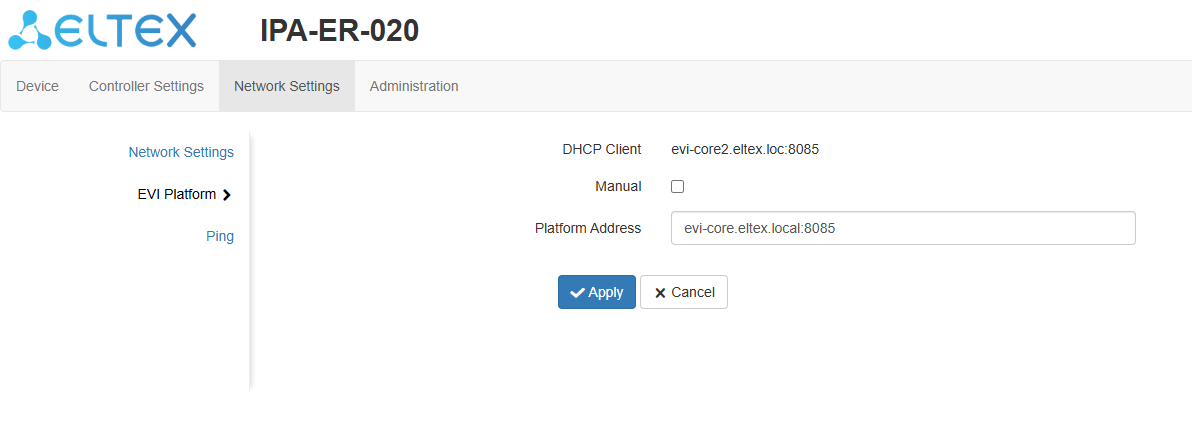 3. Switch to the "EVI Platform" page. When using the "DHCP client" mode, it is possible to specify option 43 (Vendor Specific Information) on the DHCP server to automatically connect the controller to the EVI platform. If it is necessary to to enter the address manually, check the box next to the "Manual" item and register the server address.