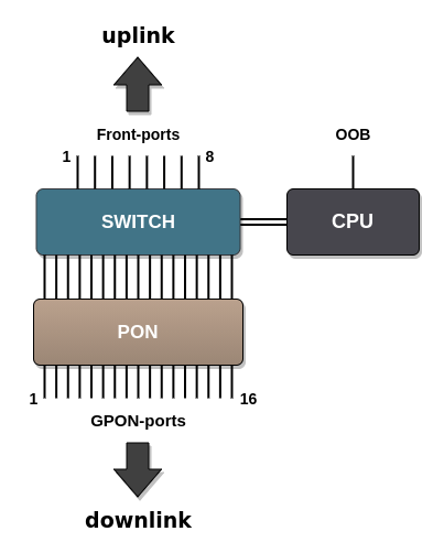 The key PON advantage is the use of one Optical Line Terminal (OLT) for multiple Optical Network Terminals (ONT). OLT converts Gigabit Ethernet and GPON/XGS-PON interfaces and is used to connect a PON network with data communication networks of a higher level.