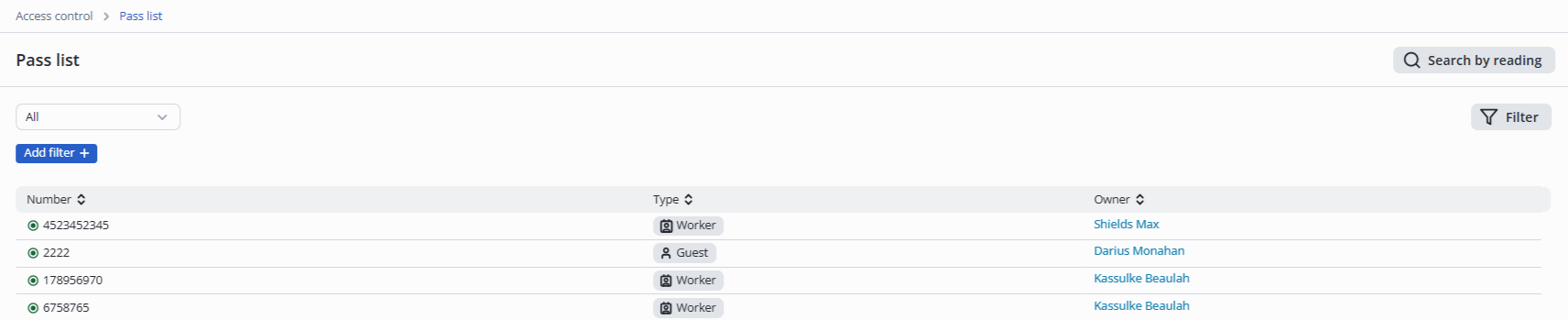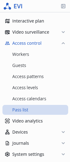 Enter the Access control section, and select the Pass list item in the menu.