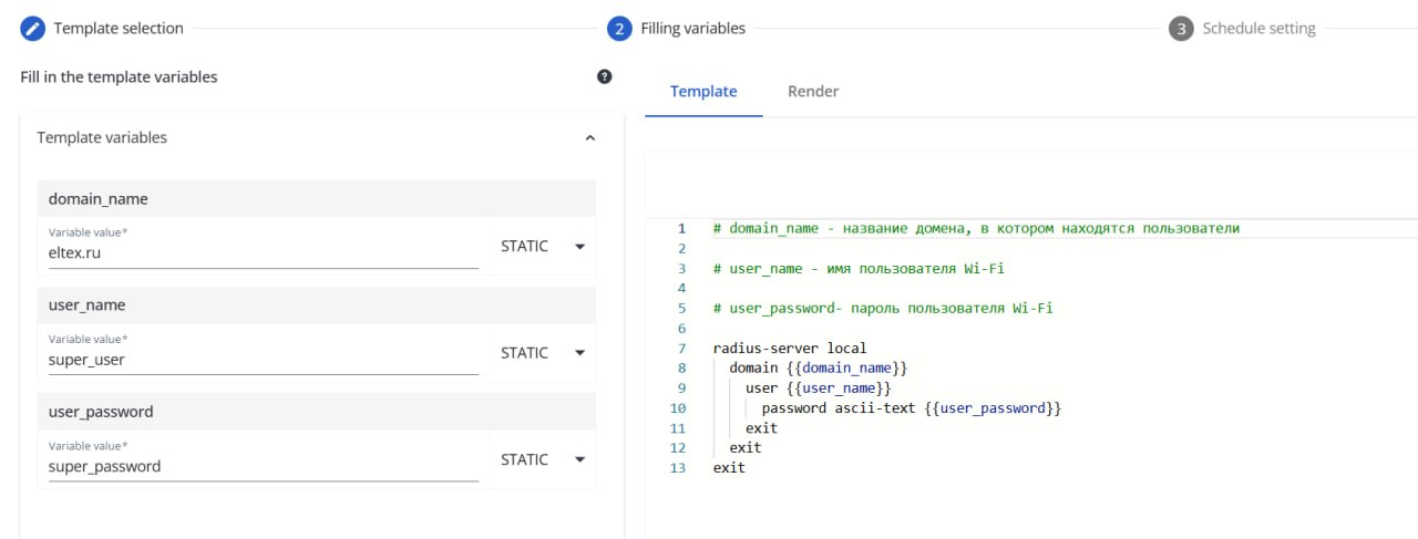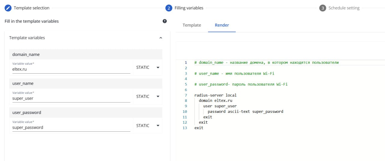 In the examples above {{ community }}, {{ mode }}, {{ intf }}, {{ description }} and {{ address }} are variables, values of which are specified at the step 2 of the configuration wizard (details are provided in the "Applying the configuration template" section of this guide).