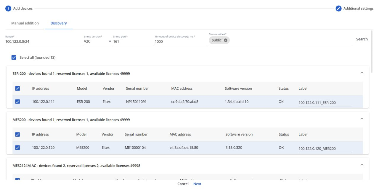 In the “Discovery” tab of the device addition window, devices connected to the network via the SNMP protocol can be detected. To do this, specify the search range and click the “Search” button. Select the devices you want to add to the system from the list of found devices, change their names (if necessary), and click the “Next” button.