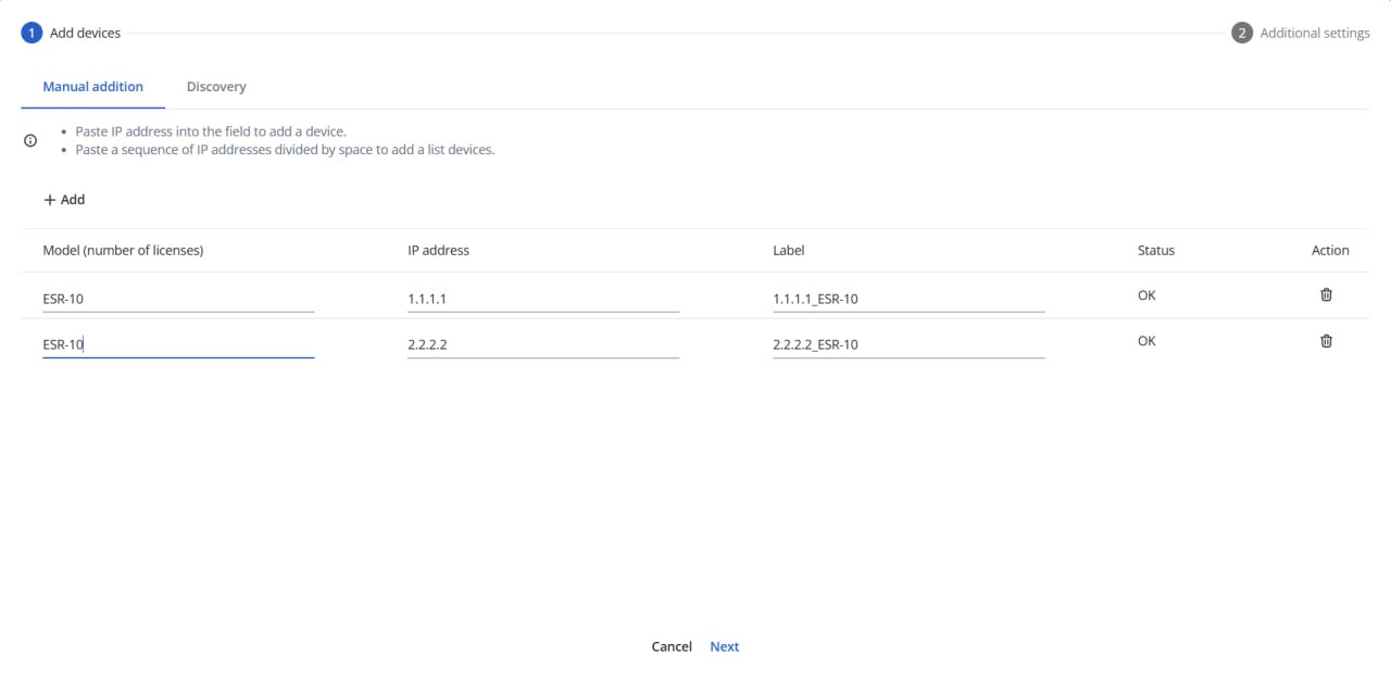 In the device addition window, on the “Manual Addition” tab, enter the device’s IP address, select its model, and, if necessary, change the device name under which it will be displayed in the system. Click the “Next” button located at the bottom of the window.