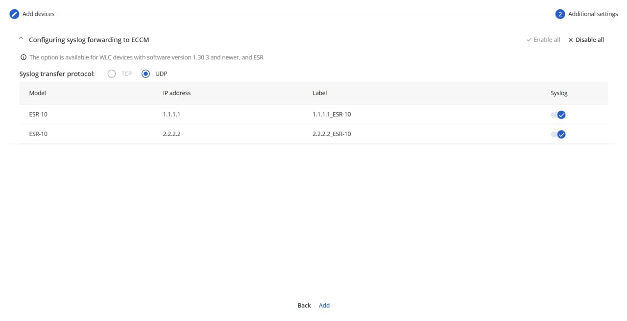 On the additional settings page, select the devices for which the transmission of syslog messages to ECCM needs to be configured, and select the syslog transmission protocol. Click the “Add” button located at the bottom of the window: