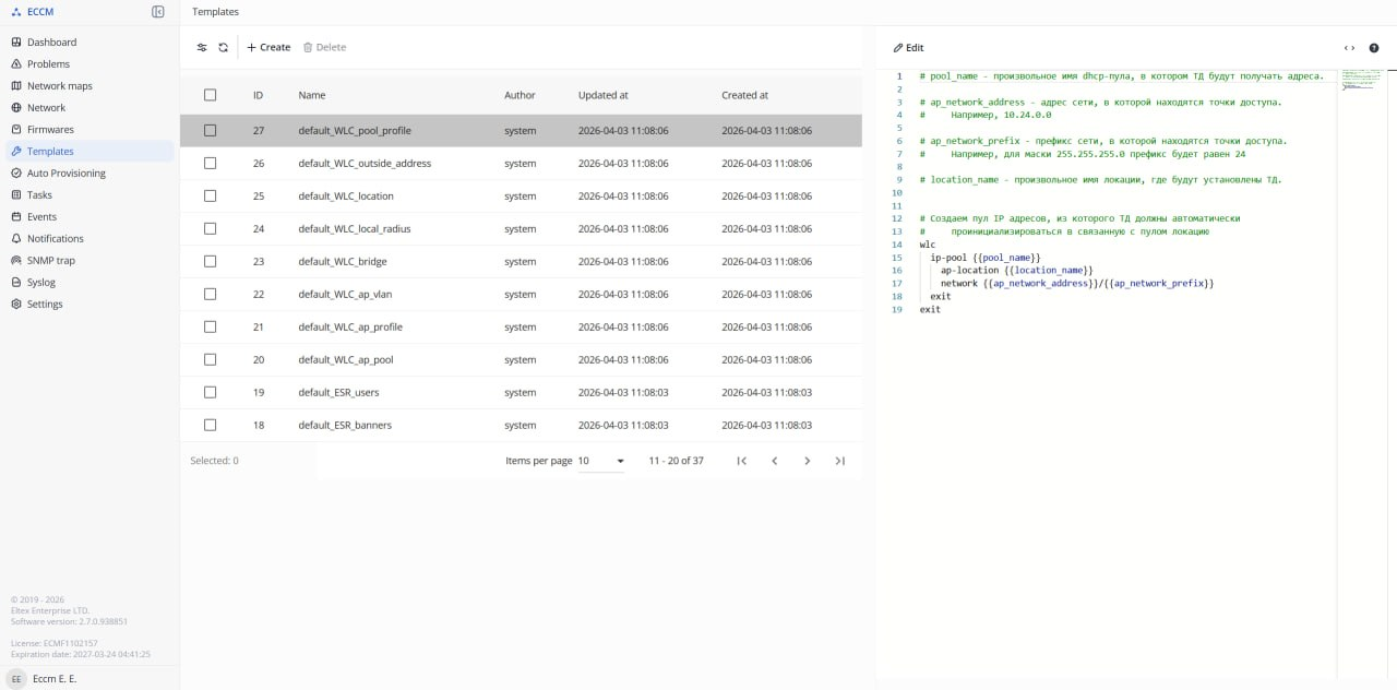 To create a template, go to the “Templates” page and click the “Create” button. In the dialog box that opens, enter the template name in the corresponding field, enter the necessary configuration commands in the editor area, and click the “Create” button. The new template will appear in the list of templates: