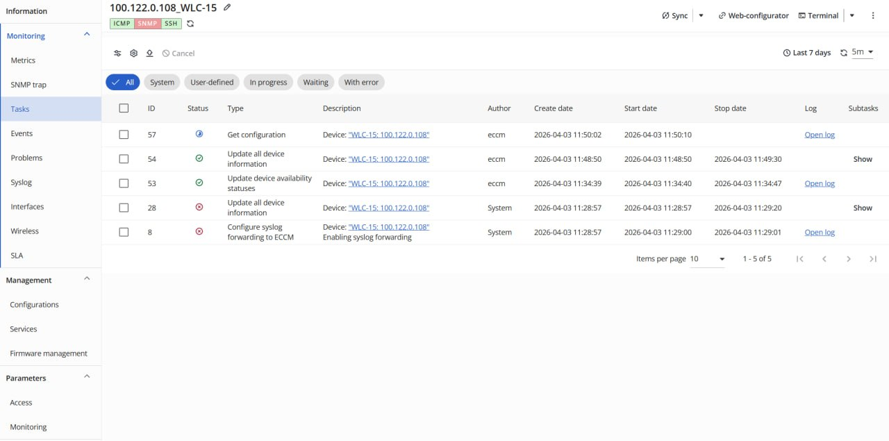 Event generation rules are designed to create events in the system. The data sources used for event logging include SNMP traps, logs, wireless events (WLC only), device SNMP metrics, and tasks performed on devices. Rules consist of groups of conditions combined using the logical operators “AND” or “OR.” Each individual condition, in turn, consists of a data element, a comparison operator, and a threshold value. When a trap or log is received, the system checks for compliance with existing rules: if the trap/log is found to match a rule, the system creates an event in the “Events” → “System” log. Event detection based on metrics, wireless events, and tasks works in a similar way, with the difference that metrics are collected directly by the system, wireless events are generated by the system itself based on logs received from WLC devices, and tasks are created within the system.