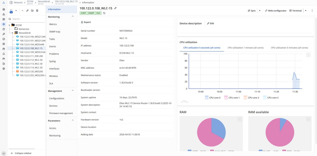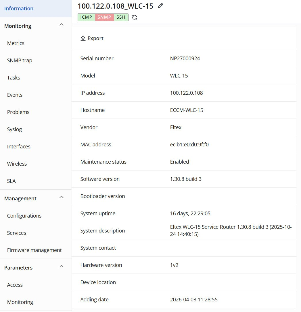 The system supports the collection of device metrics and parameters via the SNMP protocol. Device information is displayed in the “Information” and “Monitoring” menu sections on the device page.