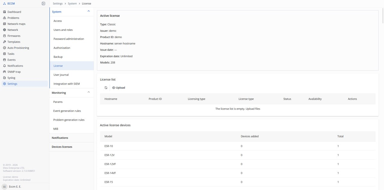 After installation, the system provides a perpetual demo license for one device of each model. To work with multiple devices of the same model, it is necessary to install the appropriate license.