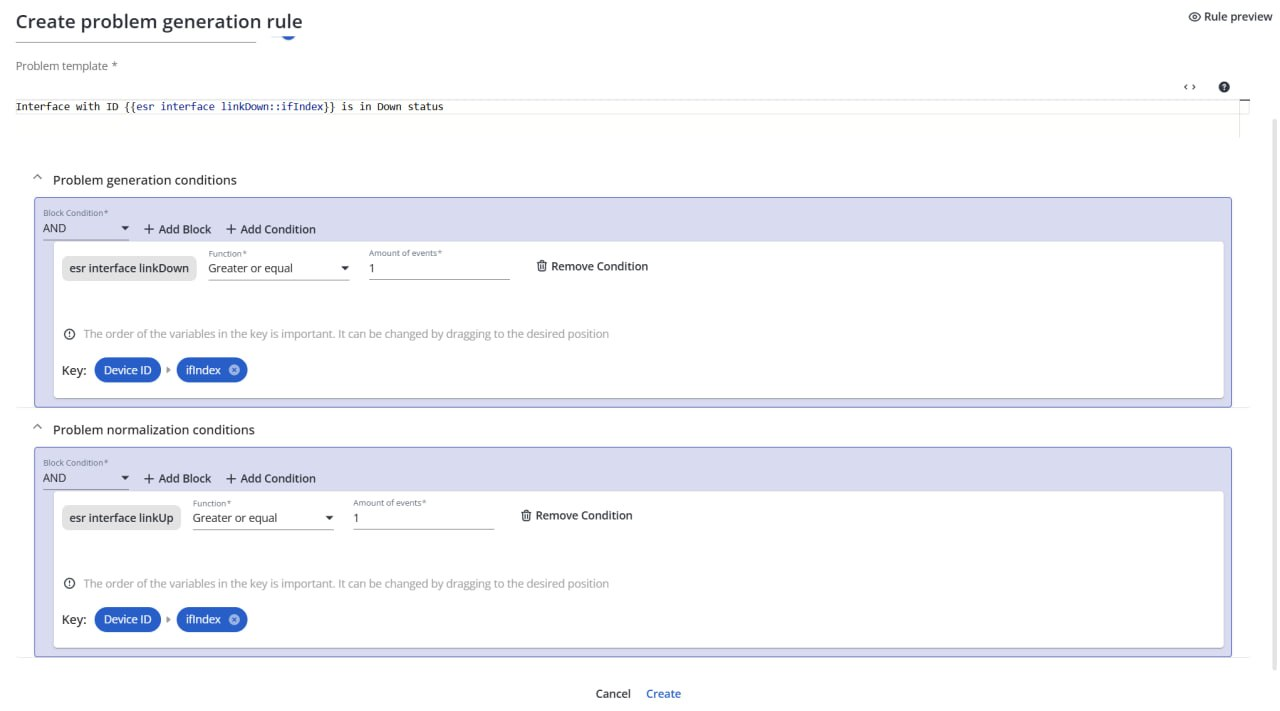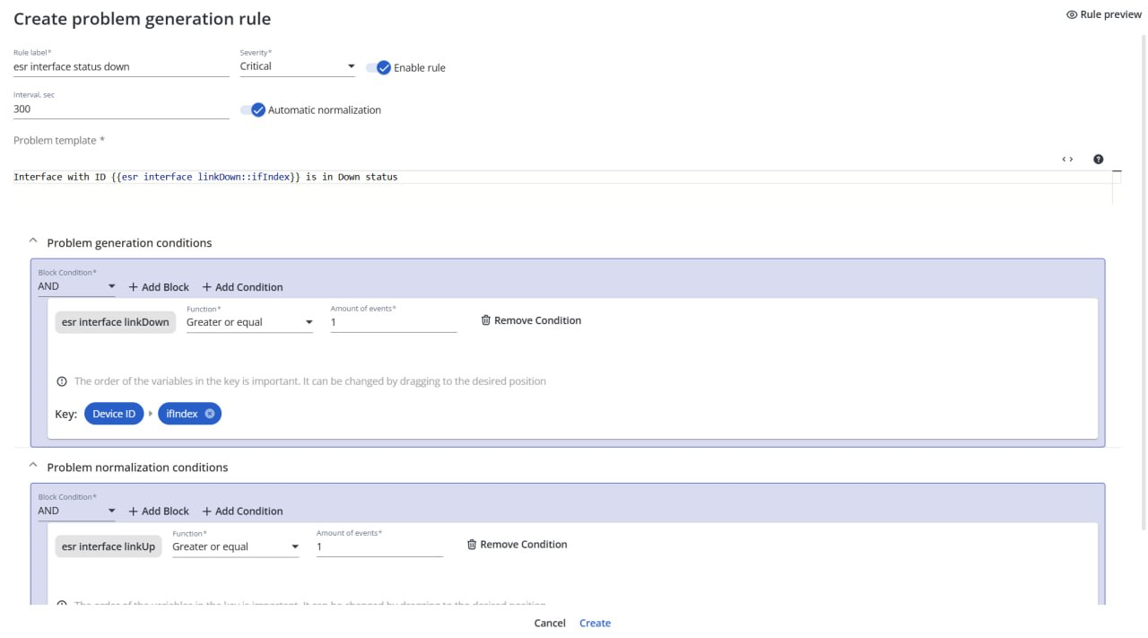 2. Create the "esr interface linkDown" rule. Fill in the following parameters: