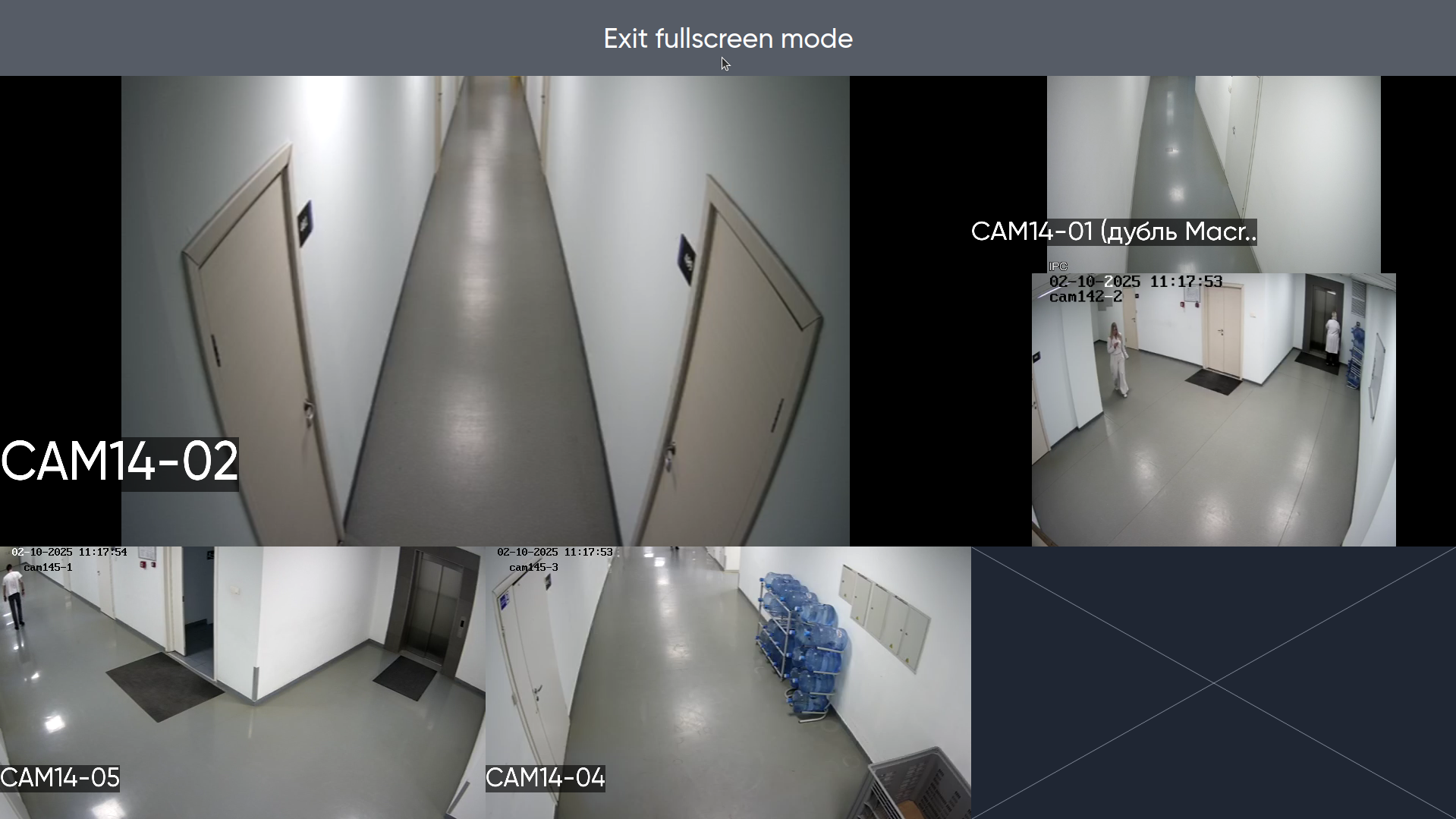 After pressing, all cameras from the current view will open in full screen mode. To exit this mode, use the Esc key on the keyboard.