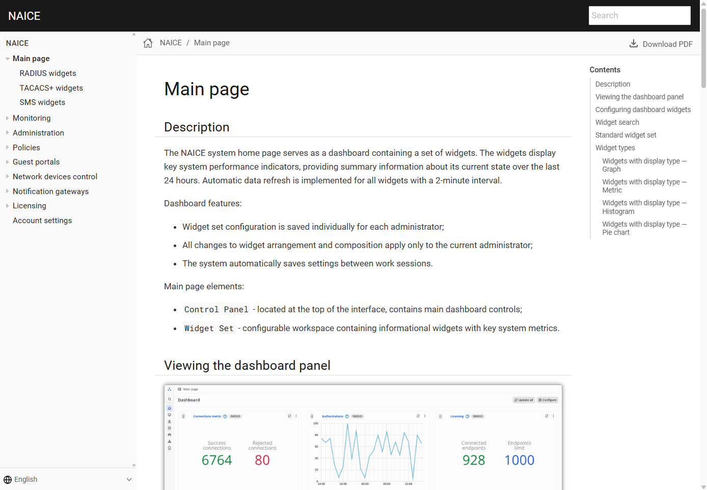 - In the upper-right corner, there is a search field and a Download PDF button that allows exporting the documentation as a PDF file;