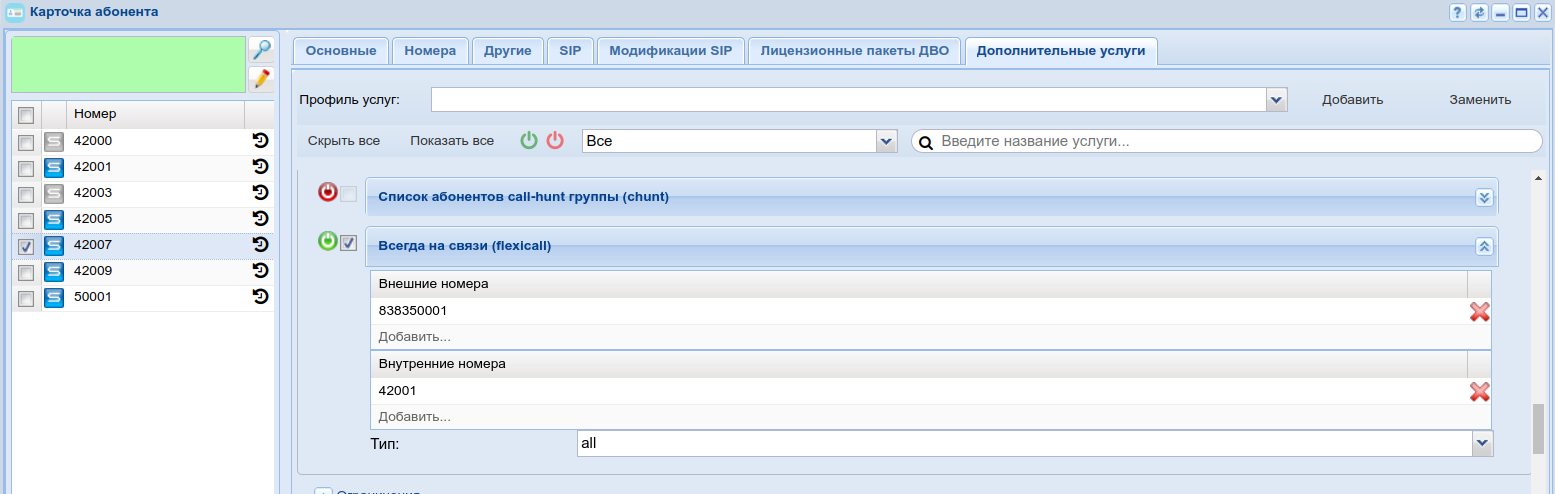 /domain/test_domain/ss/activate 42007 flexicall mode = all,external_numbers = [838350001],internal_numbers = [42001]