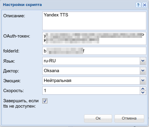 Для синтеза речи, необходимо задать параметры Яндекс TTS (text to speach/ перевод текста в голос) на уровне настроек скрипта. Для входа в меню настроек нажмите кнопку