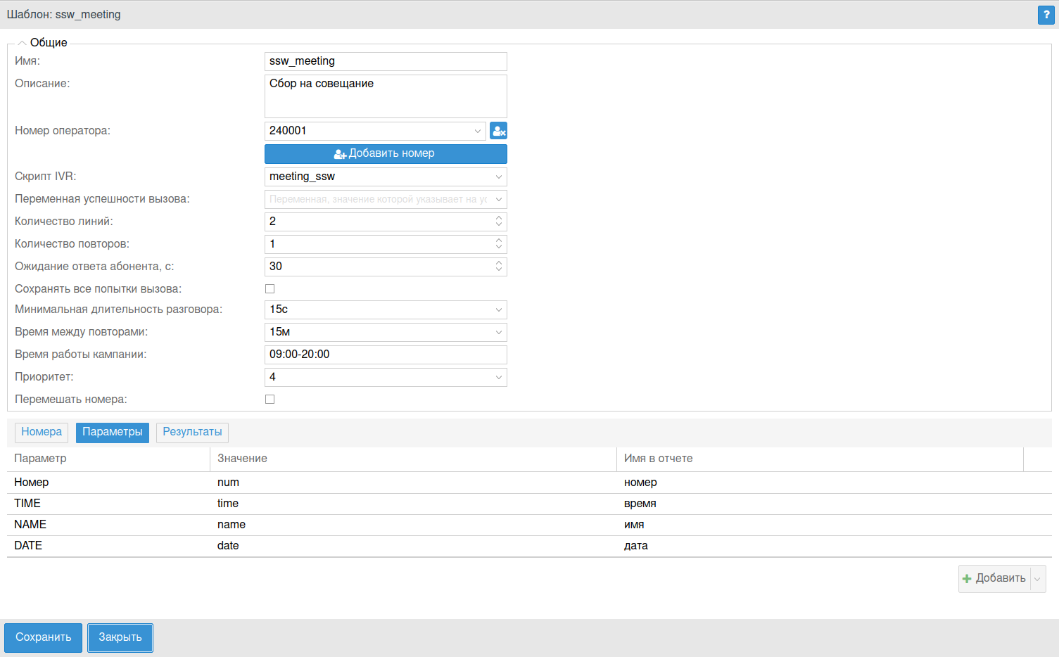 - Создать шаблон(ы) , указав в нем все параметры, необходимые для обзвона абонентов;