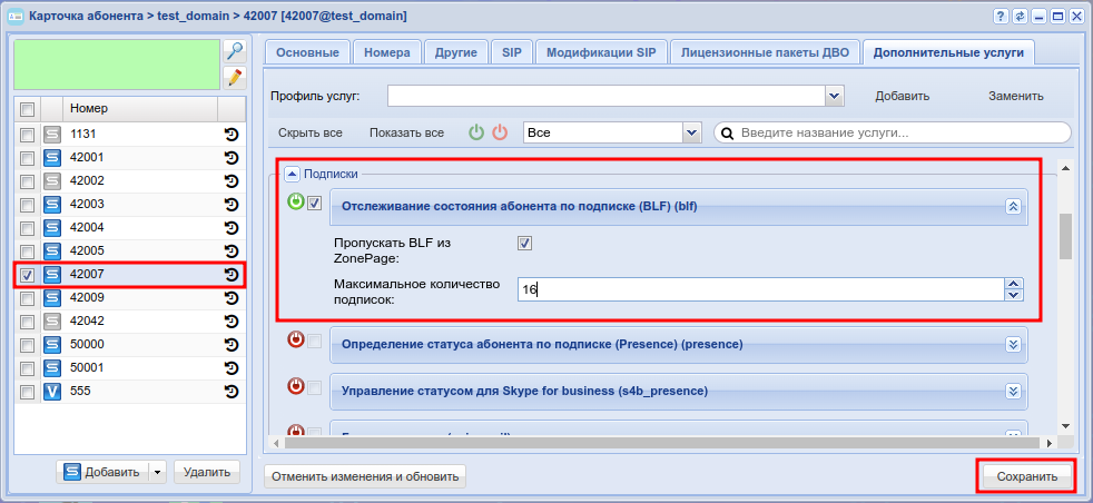Активировать услугу Отслеживание состояния абонента по подписке (blf)" ("Busy Lamp Field") для абонента с номером 42007 виртуальной АТС "test_domain".