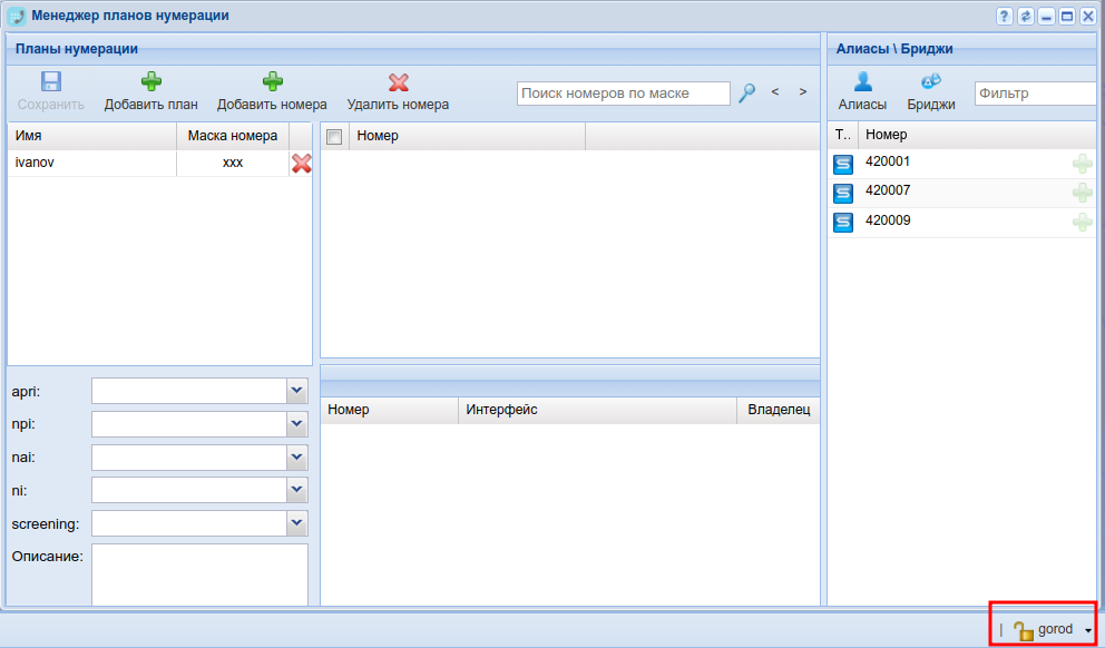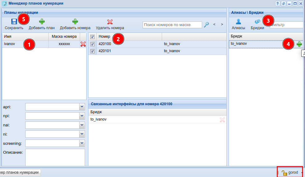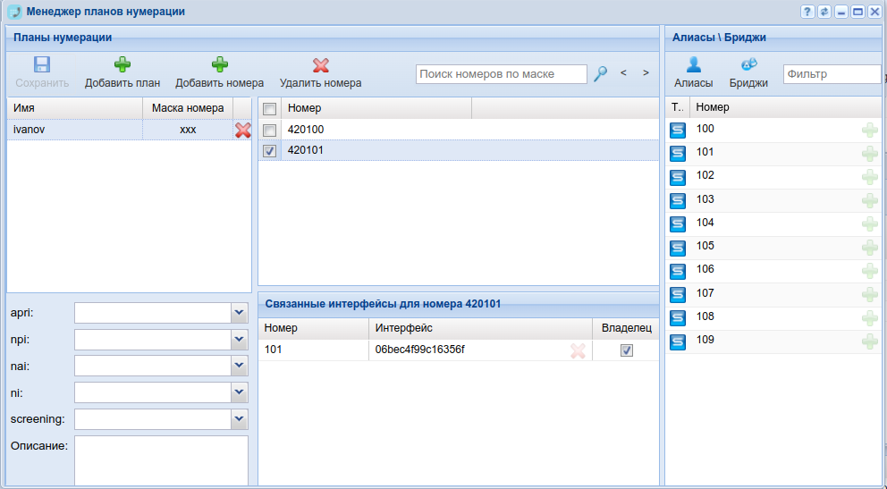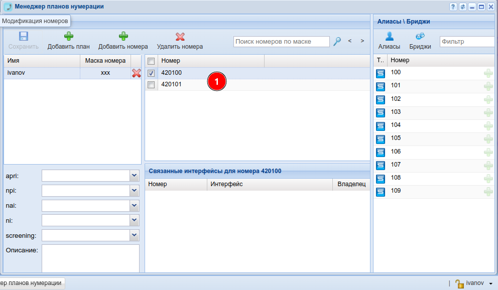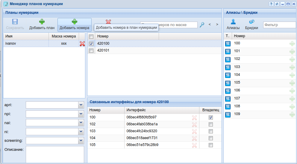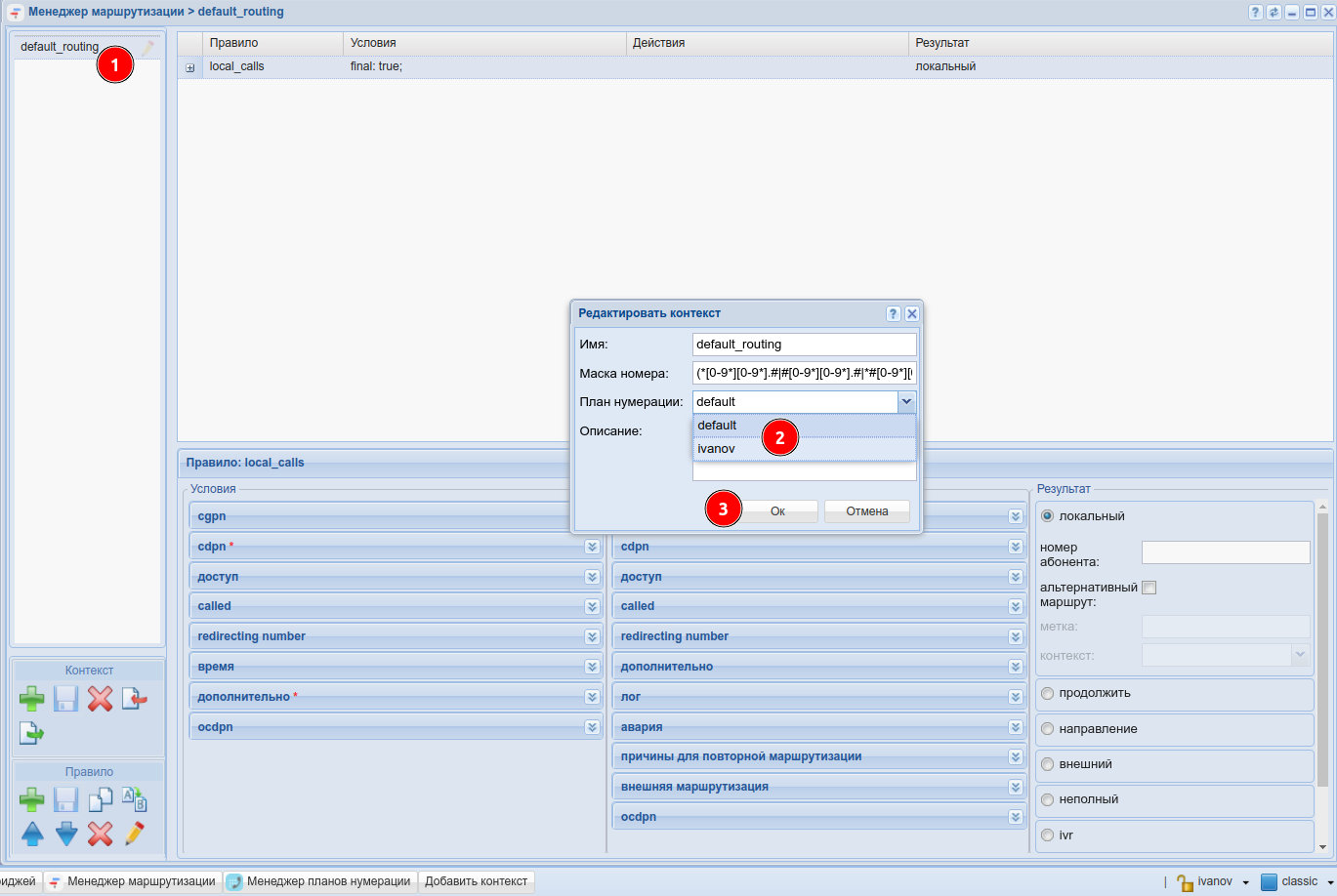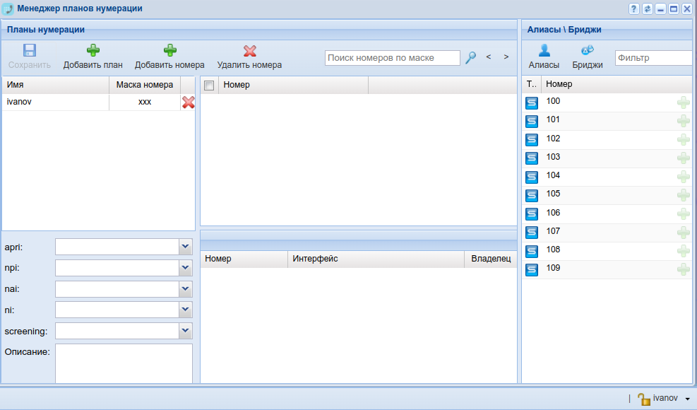 • в вАТС , выбрать приложение "Менеджер планов нумерации" в домене "ivanov"