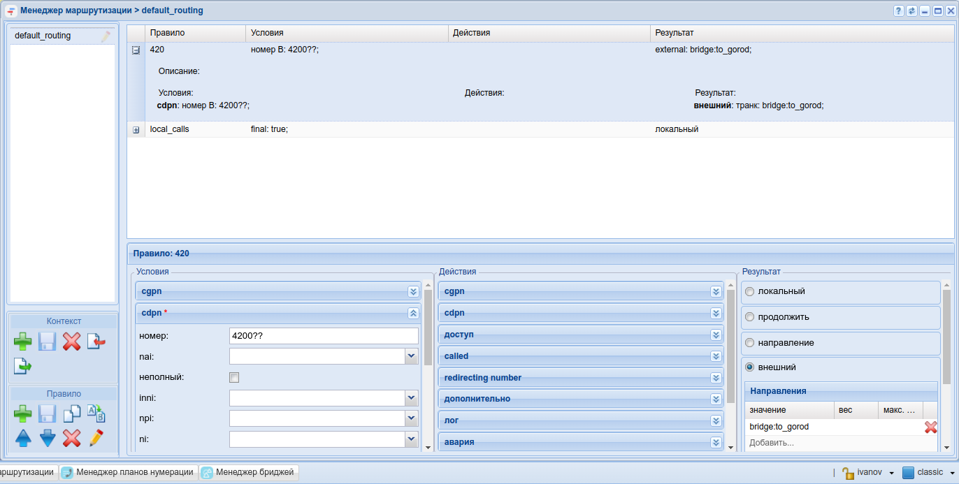 этим правилом мы направим все звонки на номера 420100/420101 в бридж с именем "to_ivanov"