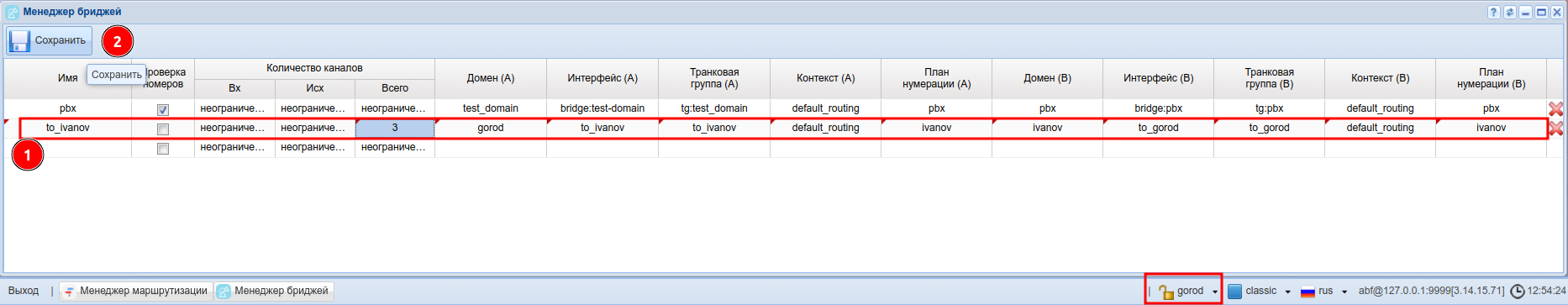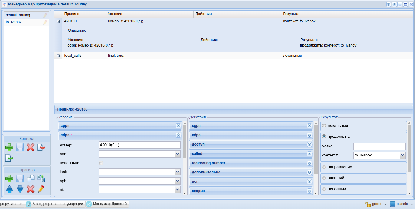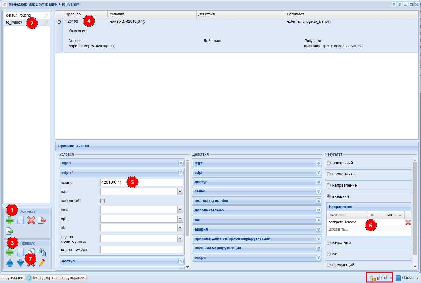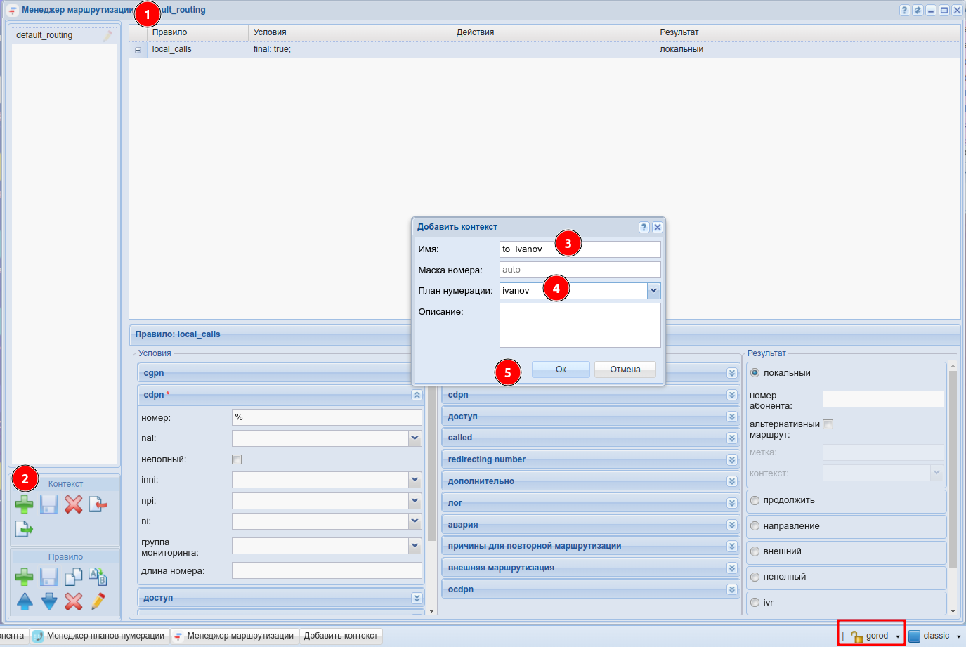 Создадим на домене "gorod" контекст маршрутизации, название — "to_ivanov", план нумерации — "ivanov".