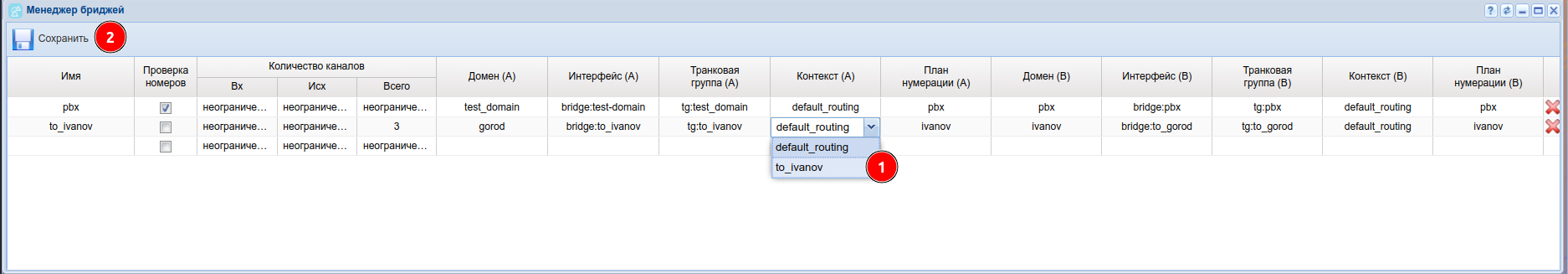 После того, как были созданы "планы нумерации" и "бридж", необходимо настроить маршрутизацию между доменами. Для этого создадим контекты маршрутизации.