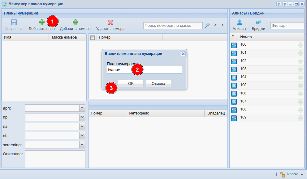 2. Выбрать ранее созданное имя плана нумерации "ivanov"