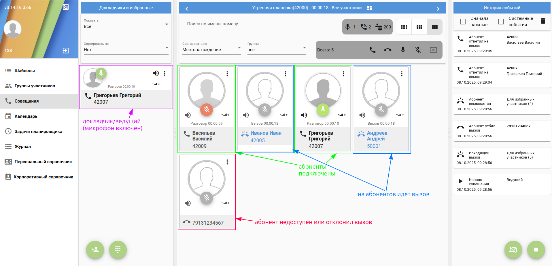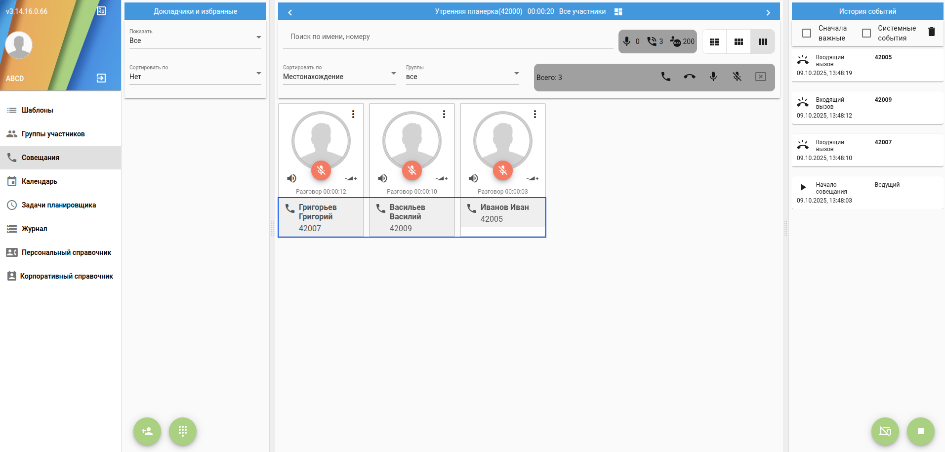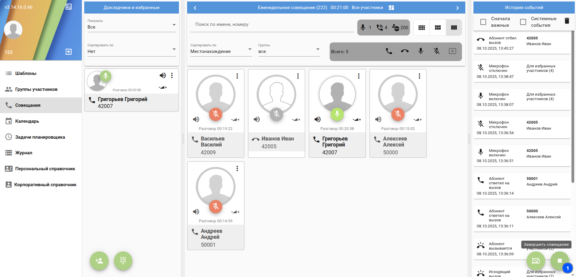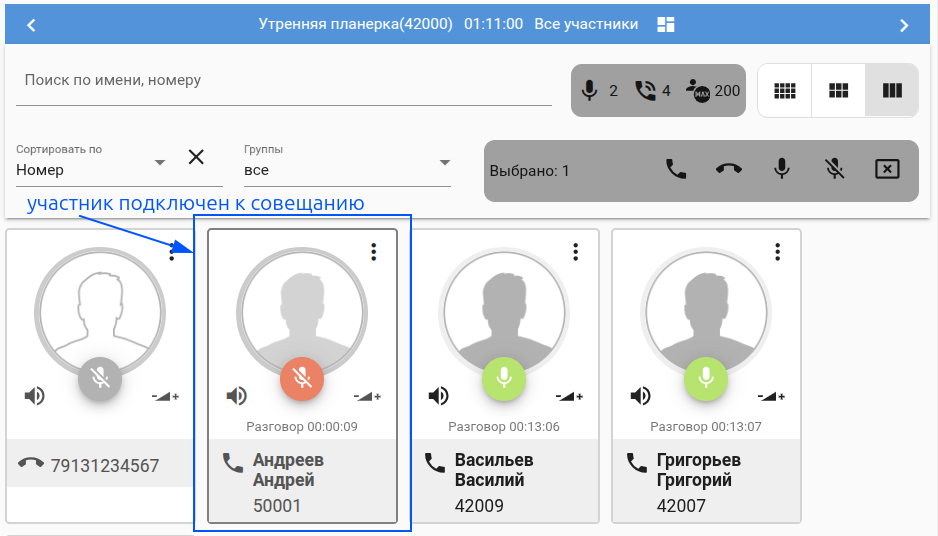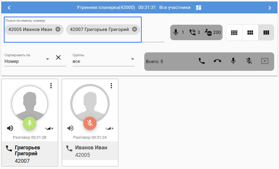 Менеджер совещания"manager" (или администратор "admin") имеет возможность управлять данным совещанием - вызывать/отключать абонентов добавленных на основе шаблона: