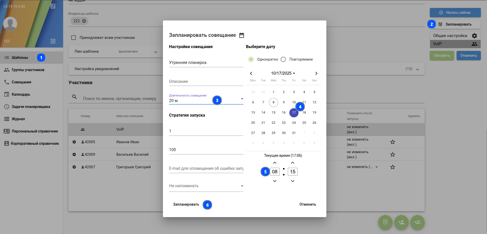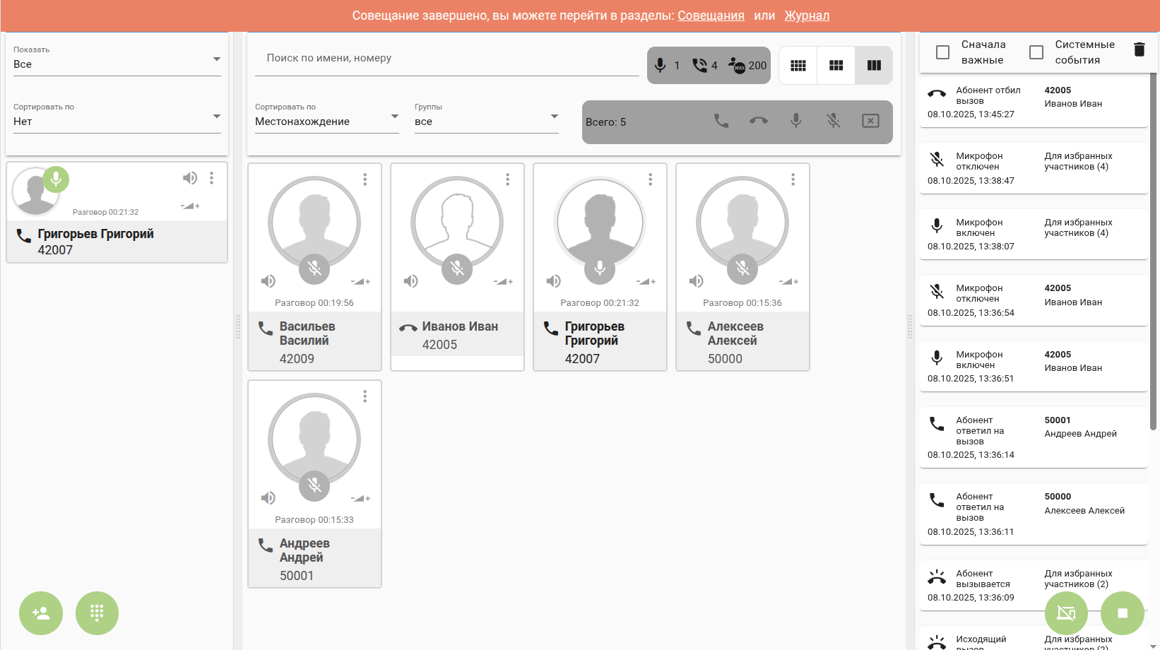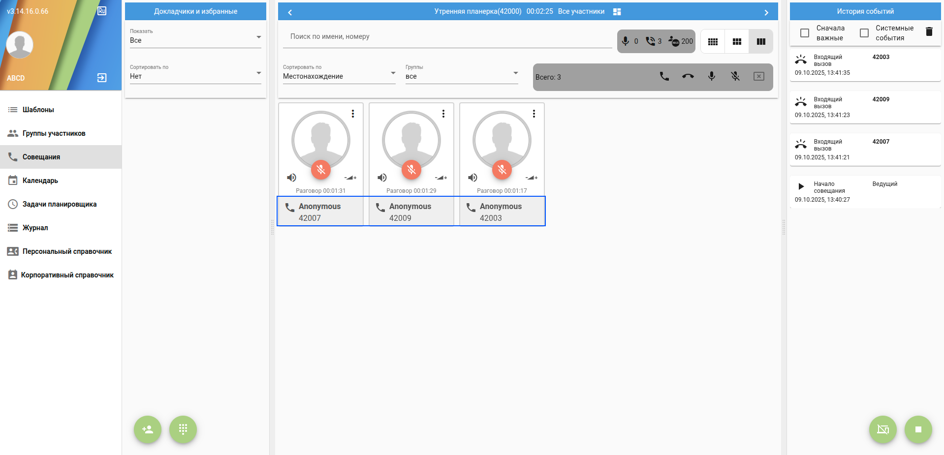 Менеджер совещания"manager" (или администратор "admin") имеет возможность управлять данным совещанием - вызывать/отключать абонентов добавленных на основе шаблона: