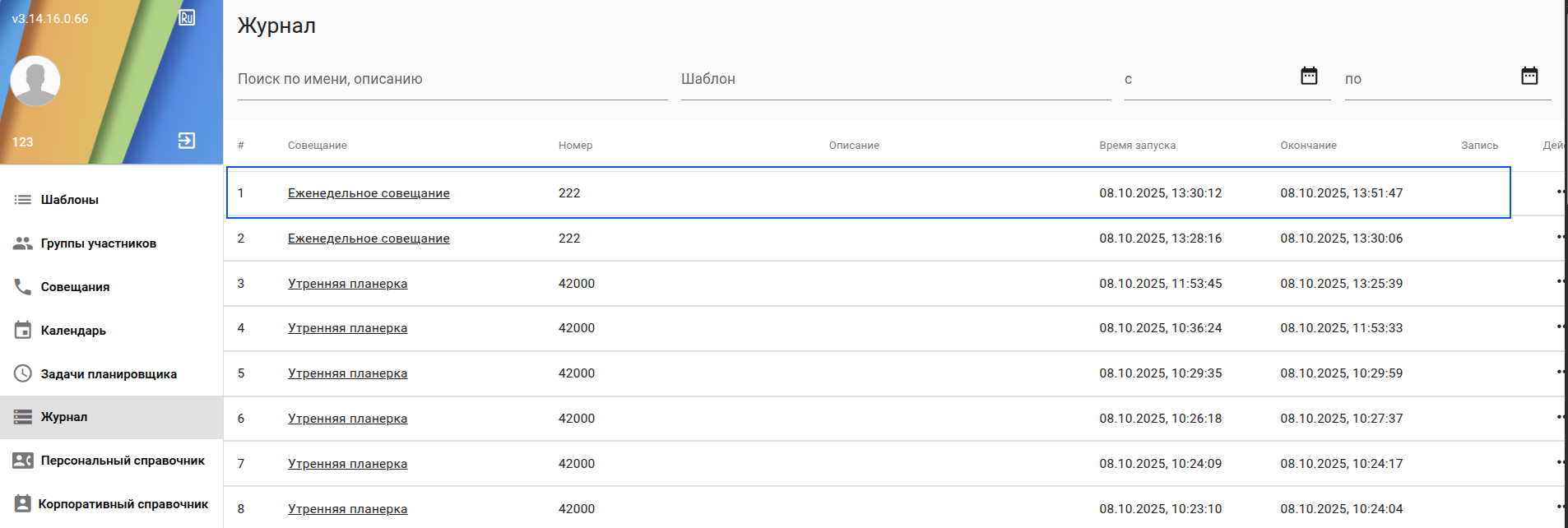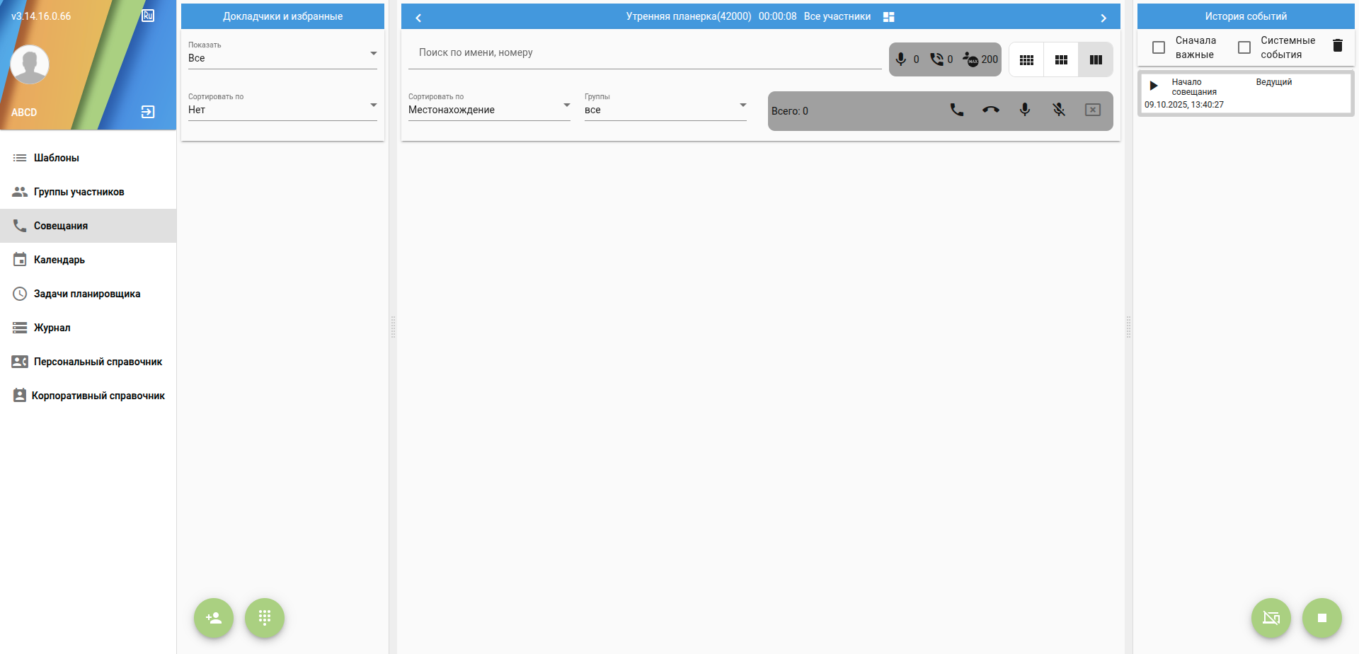 - Журнал - для просмотра к истории прошедших совещаний;