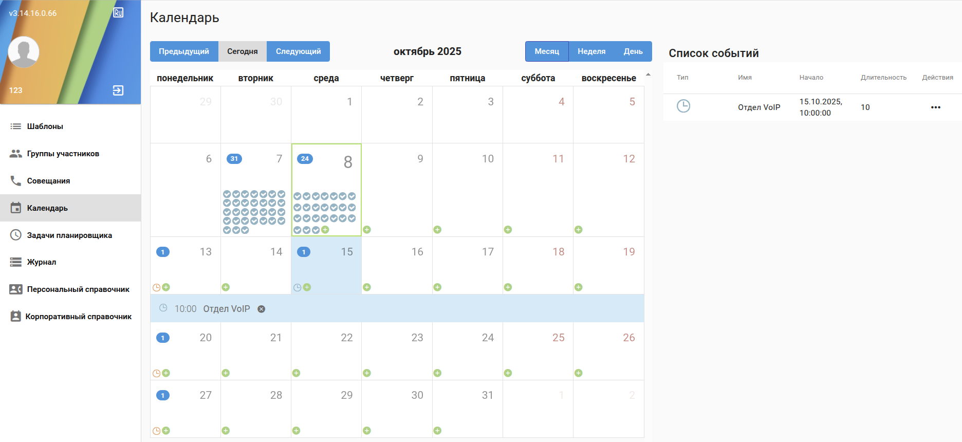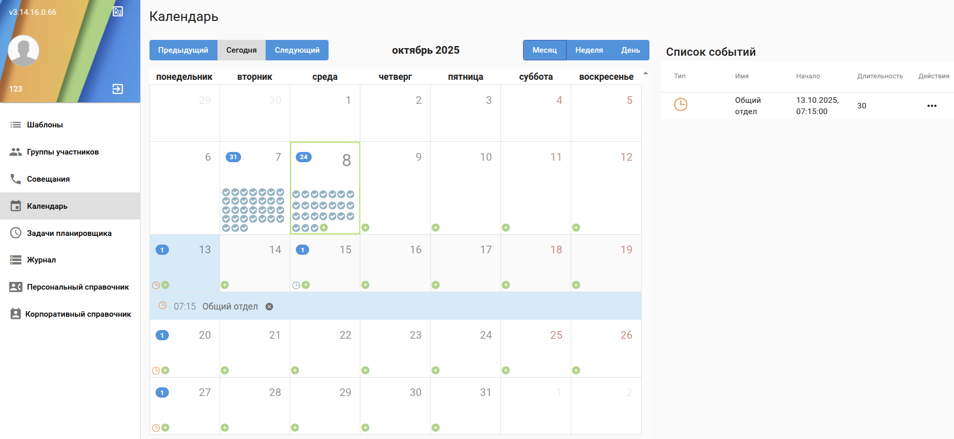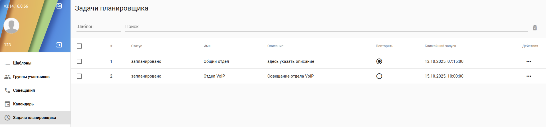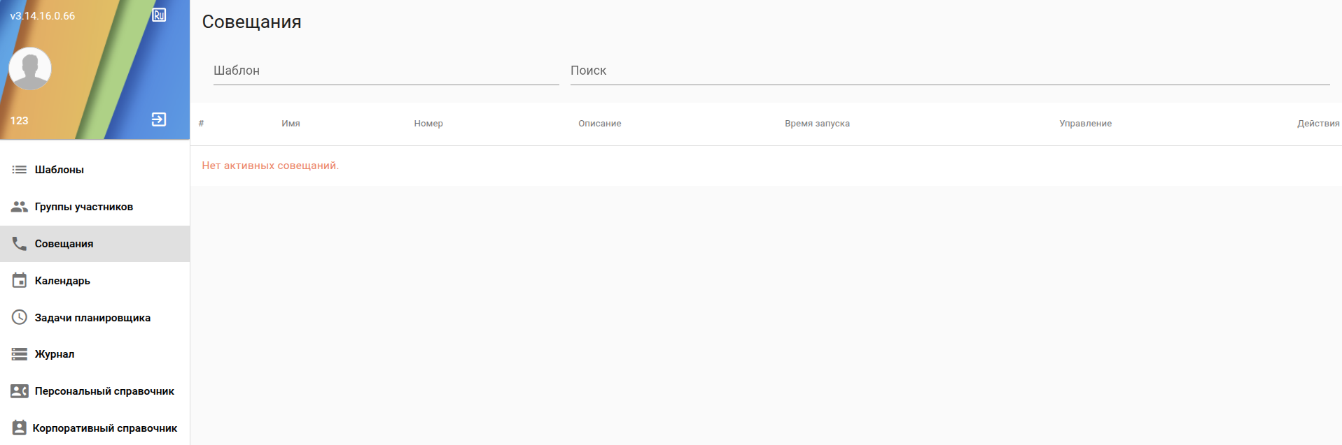 - Совещания - содержится информация об активных совещаниях /возможность просмотра /редактирования шаблона/управление совещанием;