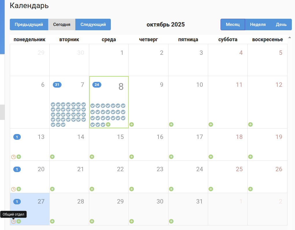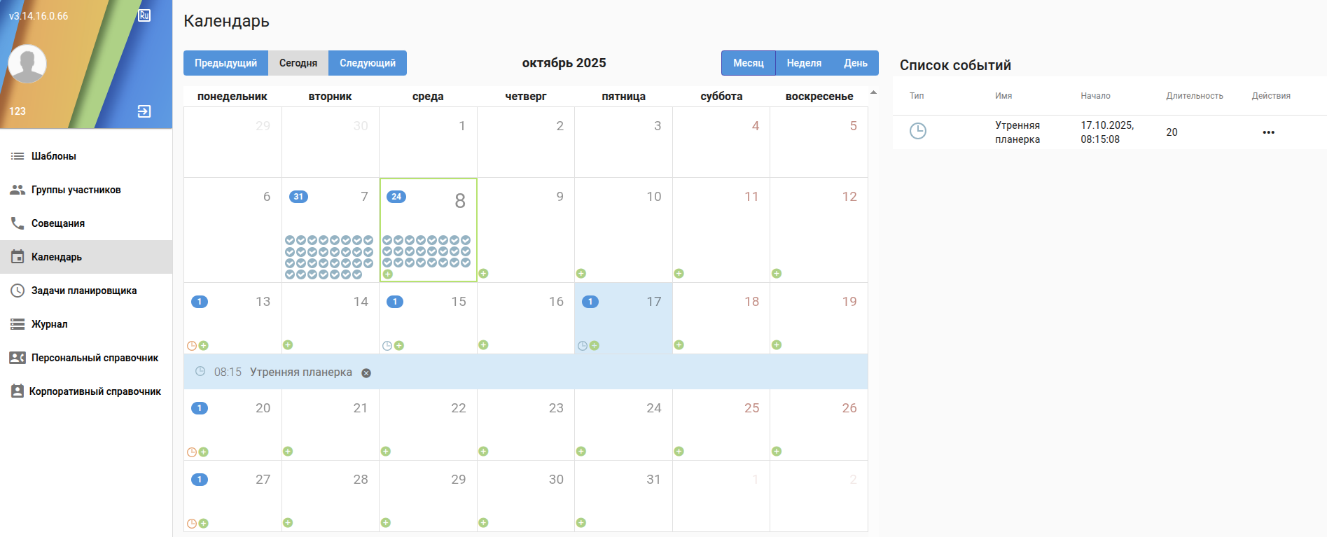 - Календарь - информация о активных, прошедших и запланированных совещаниях / с возможностью запланировать новые совещания;