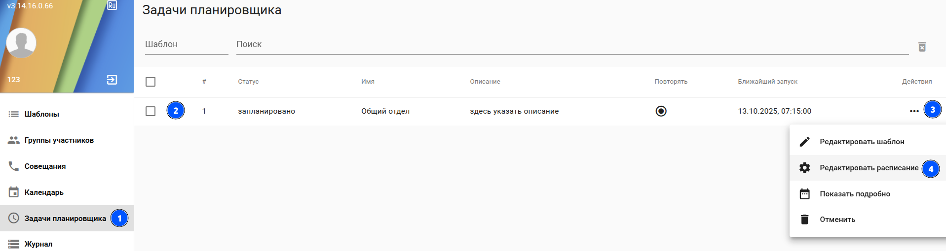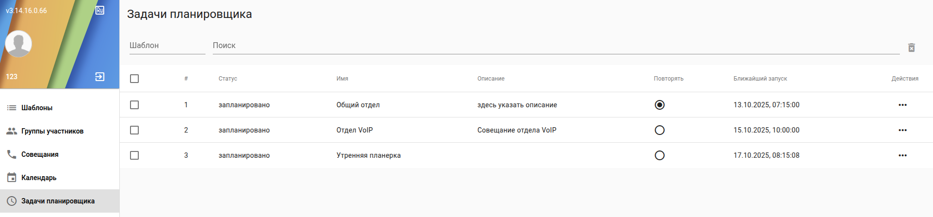 - Шаблоны - создание шаблоны совещаний / ручной запуск селекторного совещания;