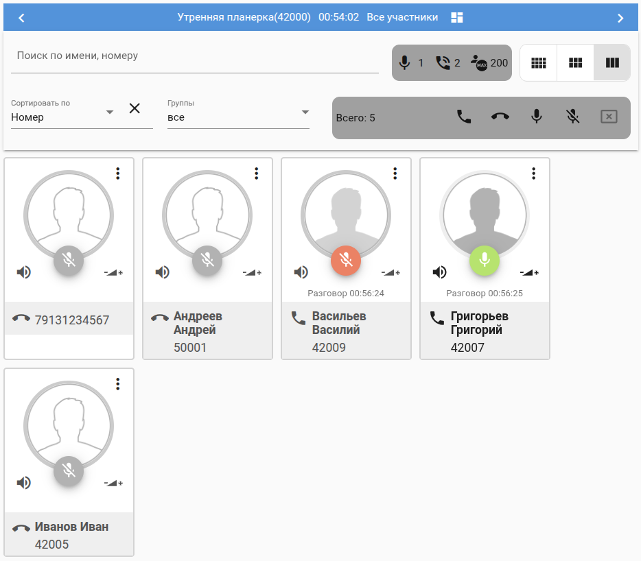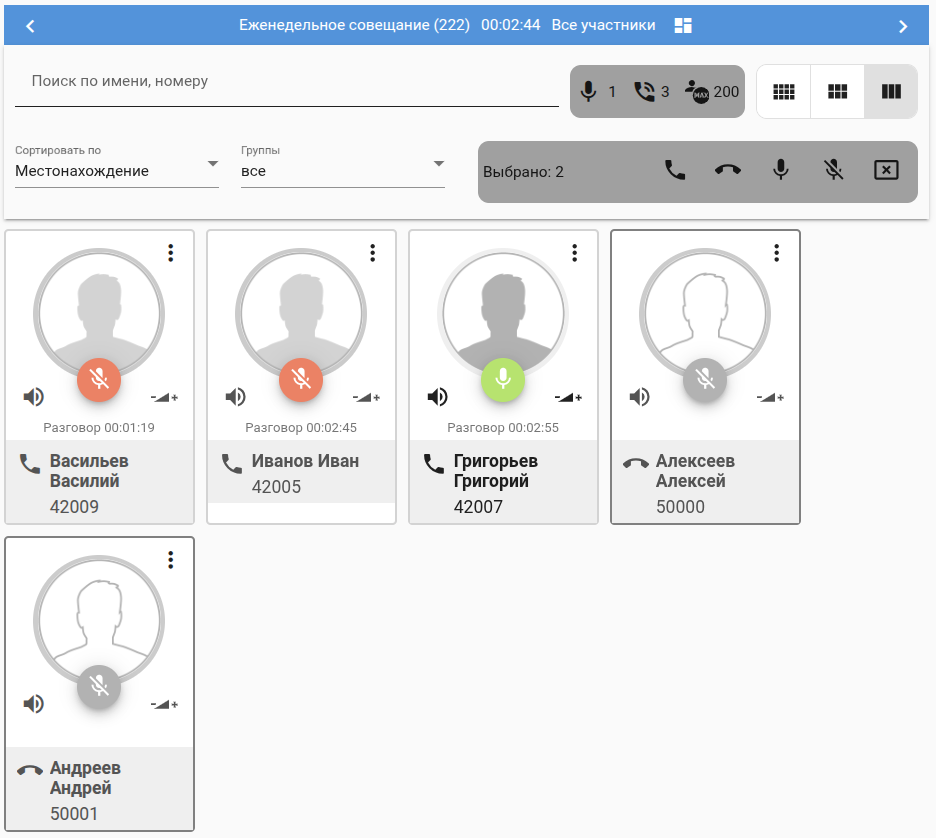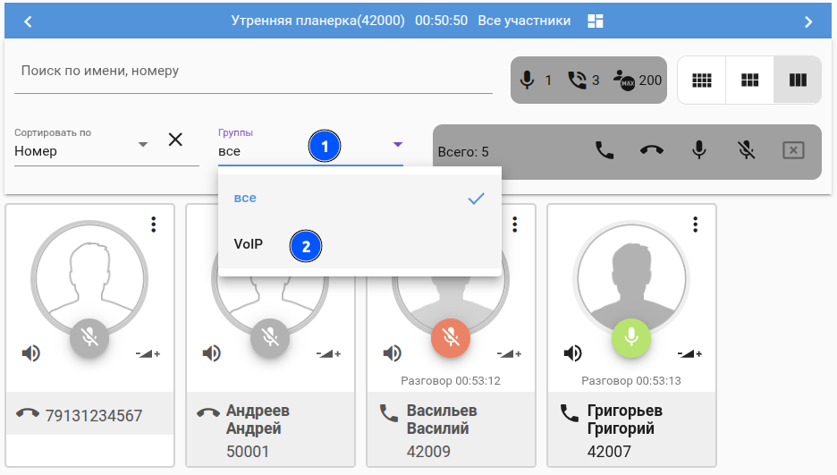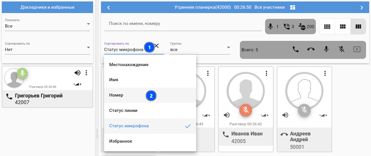 При необходимости ведущий может отсортировать участников совещания по разным критериям: Имя/номер/Статус линии/Статус микрофона/Избранное/Местонахождение: